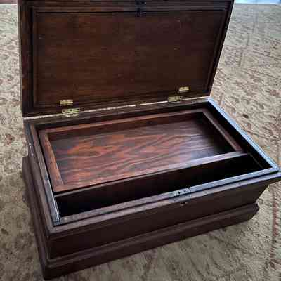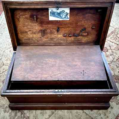 Description: A wooden tool chest with removable storage trays and additional storage area in the lid, accessed via a fold-down panel. Brass handles and hinges. Appears hand-made by John Ucovich himself. A photo or postcard of a metal machine is affixed to the lid of the chest.
