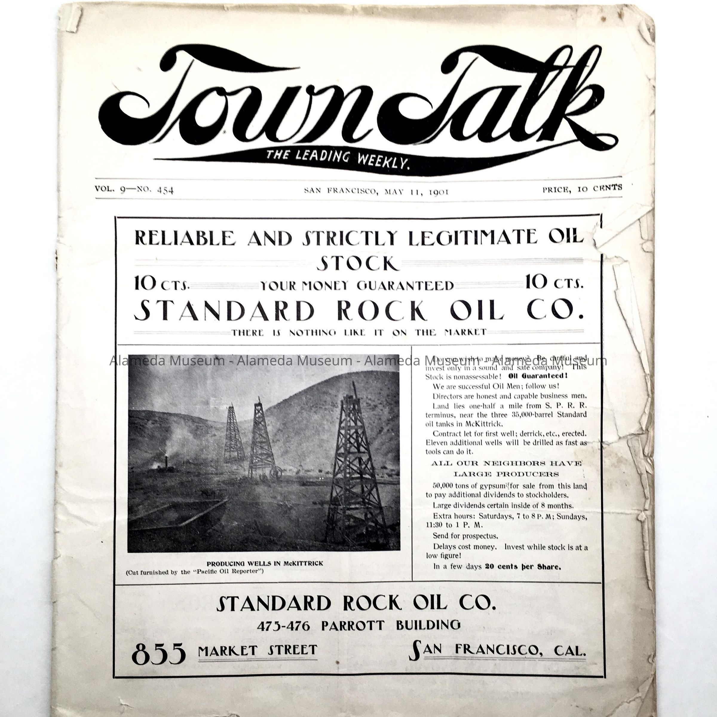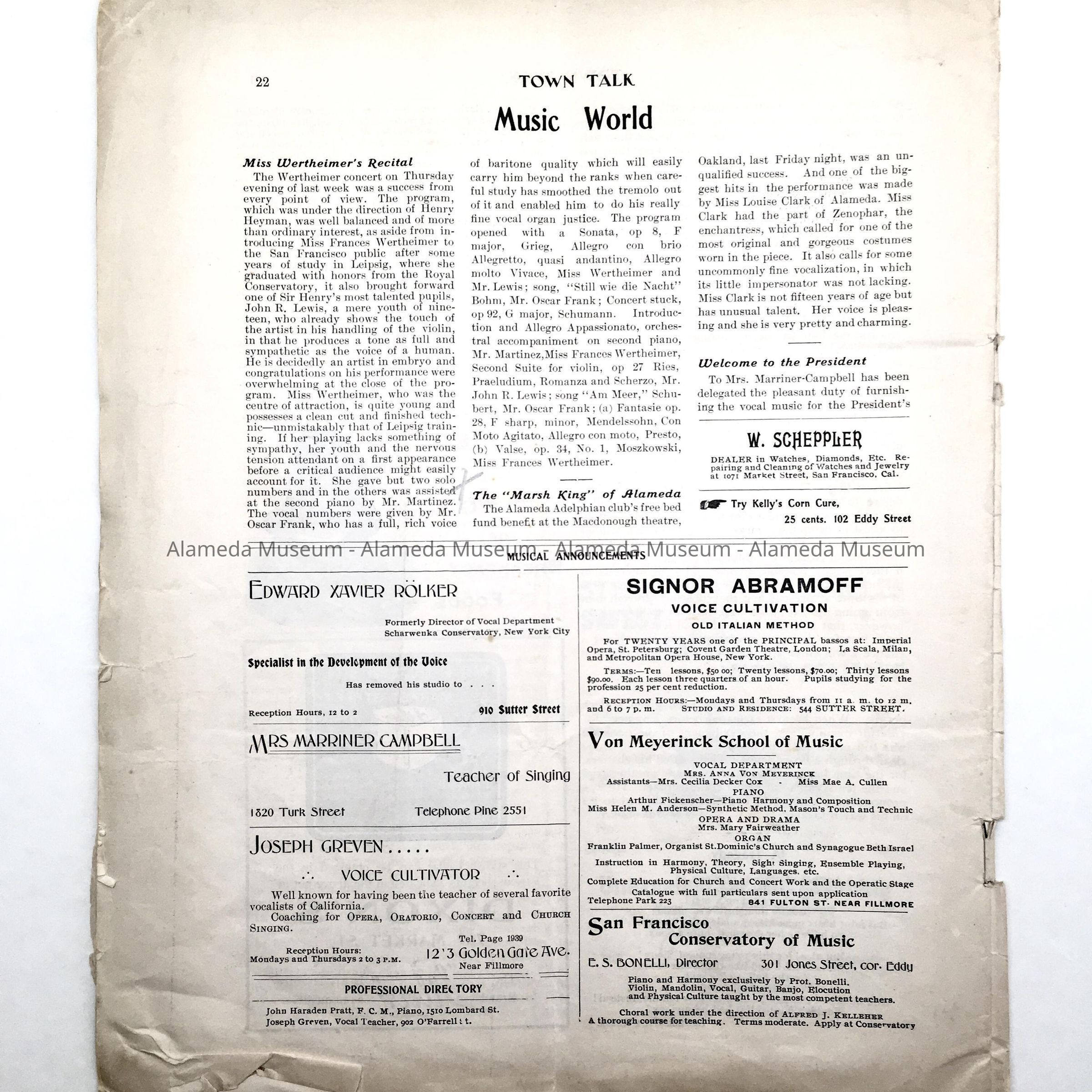 A BOOKLET ENTITLED, "TOWN TALK," ISSUED IN SAN FRANCISCO ON MAY 11, 1901. PAGE 22 INCLUDES AN ARTICLE CONCERNING "THE MARSH KING," WRITTEN BY ALAMEDA COMPOSER, CHARLES H MCCURRIE. THE PROGRAM IS EXTOLLED IN THE ARTICLE. LOUISE CLARK OF ALAMEDA PLAYED A SIGNIFICANT ROLE IN THE OPERETTA.