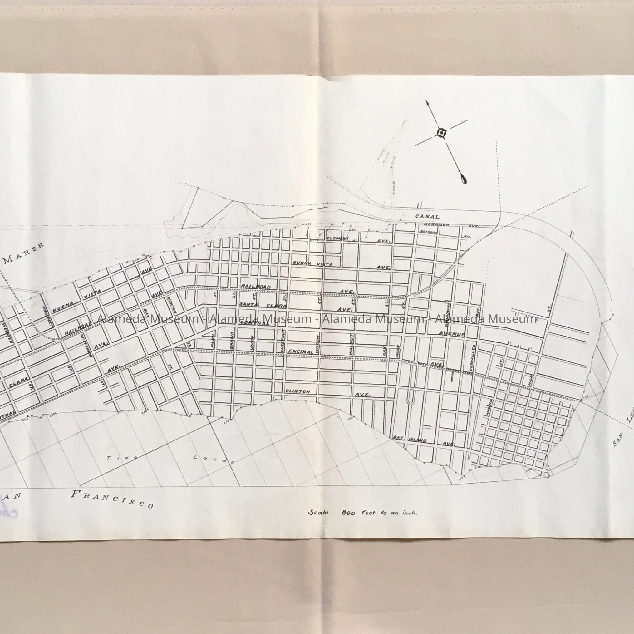 Transportation map of the City of Alameda giving the routes of the broad and narrow gauge steel trains of Encinal and Railroad (Lincoln) Avenue.