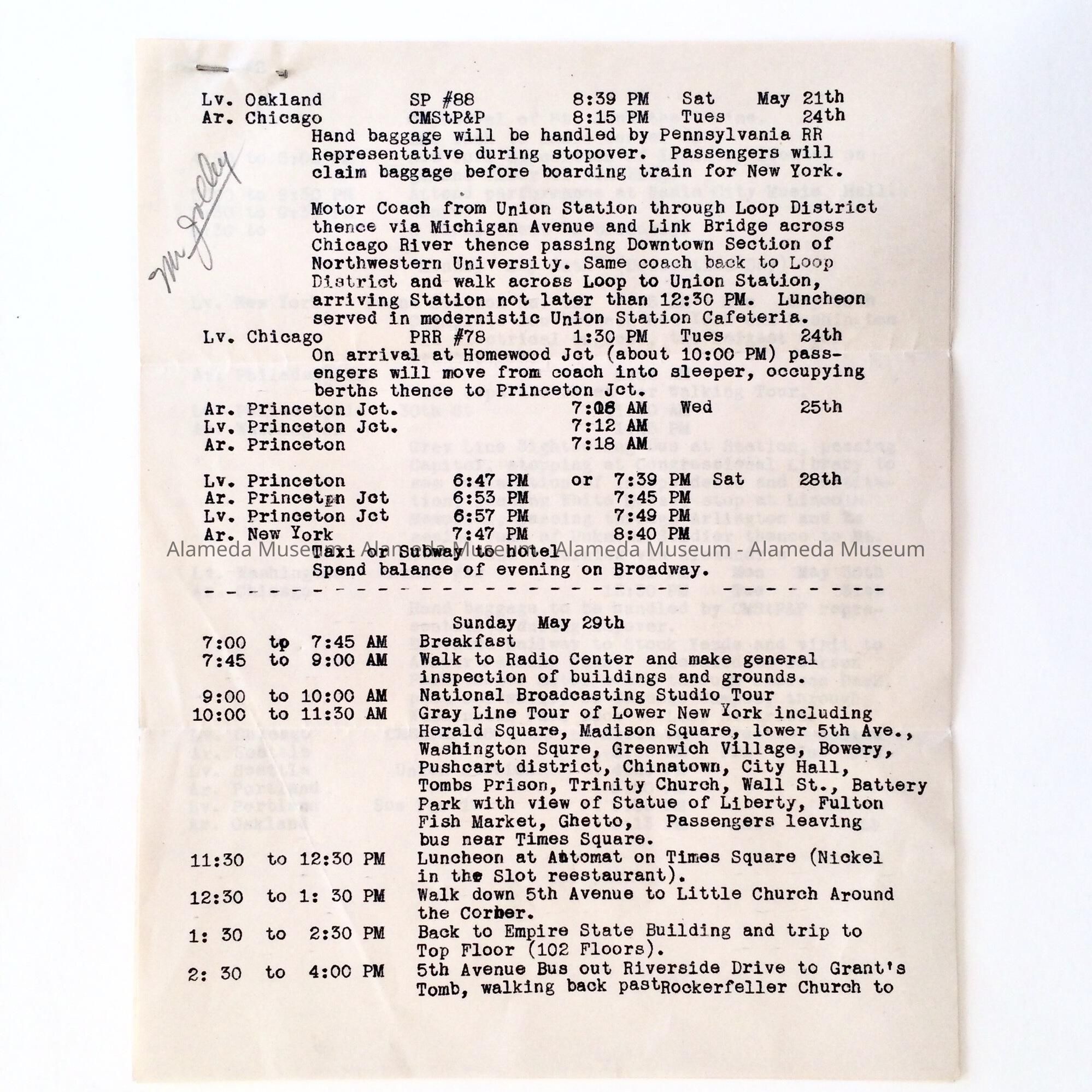 Travel itinerary for Coach Jolley and student athletes, c. 1930sEntry/Object ID