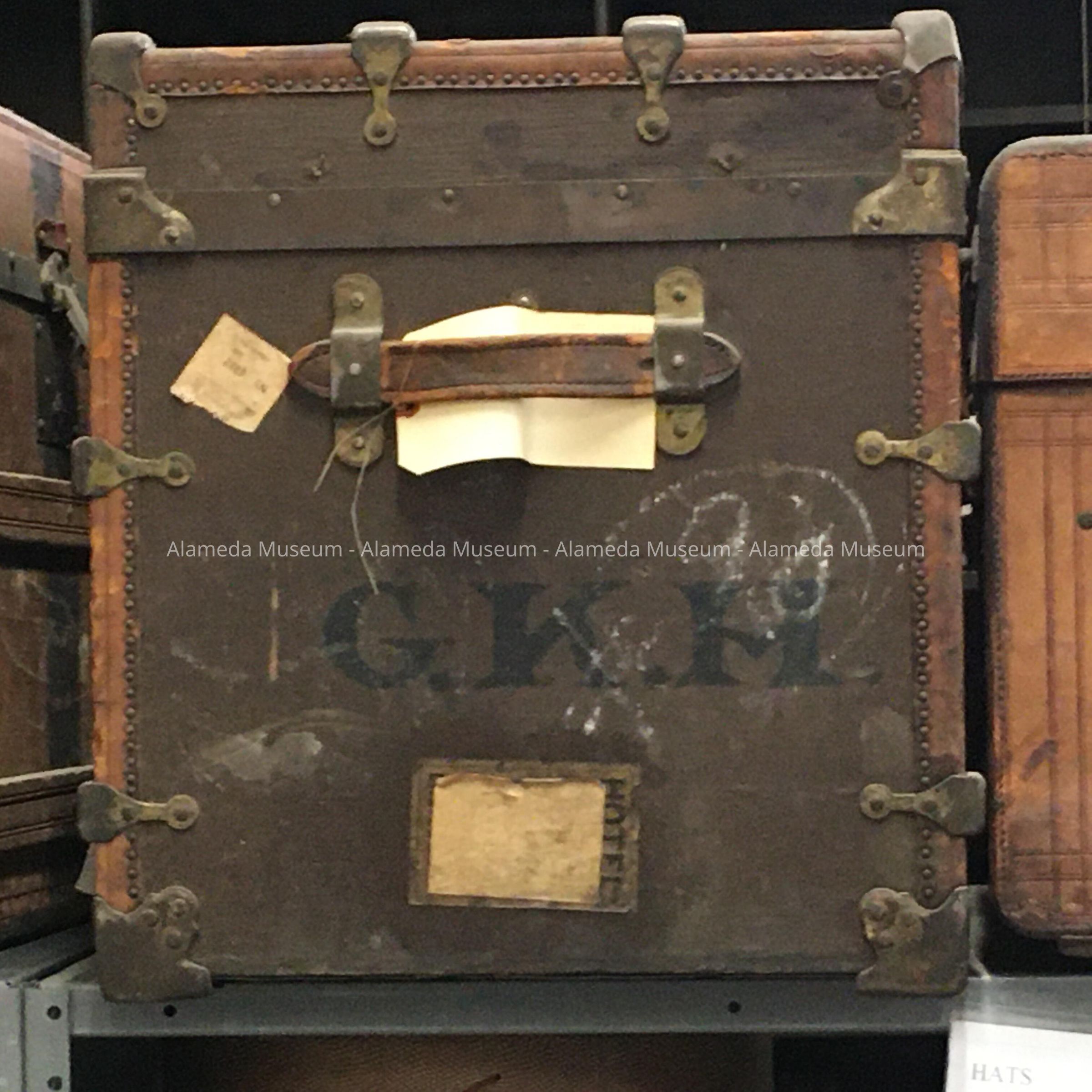 History of Object: Traveling trunk originally owned by Mr. & Mrs. Oliver Haslett, old-time residents of Alameda. The Haslett family lived at 1427 San Antonio Avenue (present site of Franklin School). Oliver, brother of Samuel M. (1605 Clinton Ave.), was the son of Samuel Haslett, founder of the Haslett Warehouses (storage & drayage), S.F.