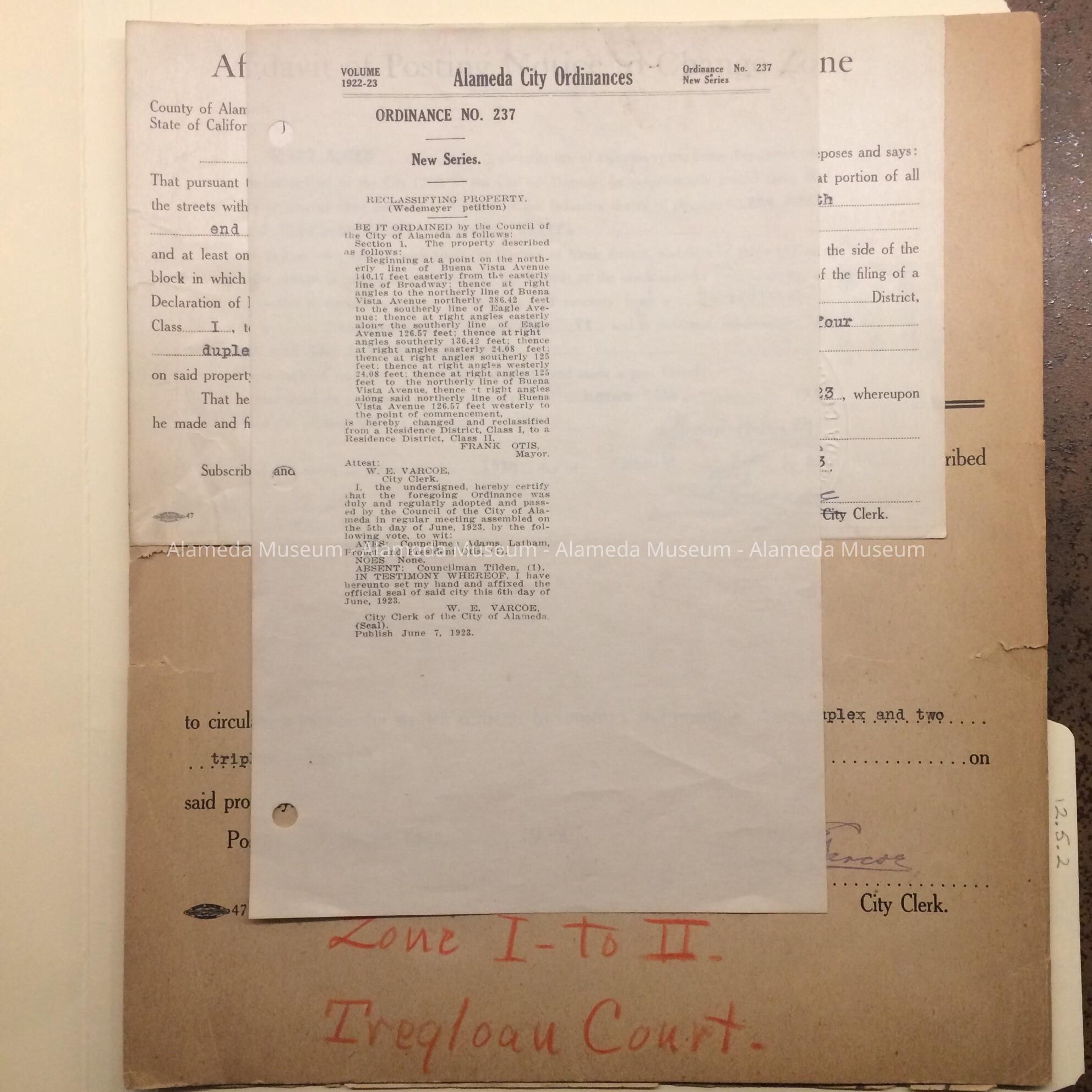 5 documents of various sizes glued together. The one on top states "Ordinance No. 237, New Series, Reclassifying Property (Wedemeyer petition). Underwritten by Frank Otis, Mayor, Attested by W. E. Varcoe, City Clerk". Another document, 'Notice to Change Zone' has in red pencil: zone I to II - Tregloan Court.