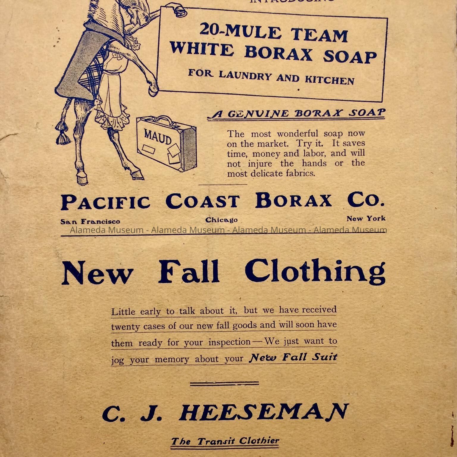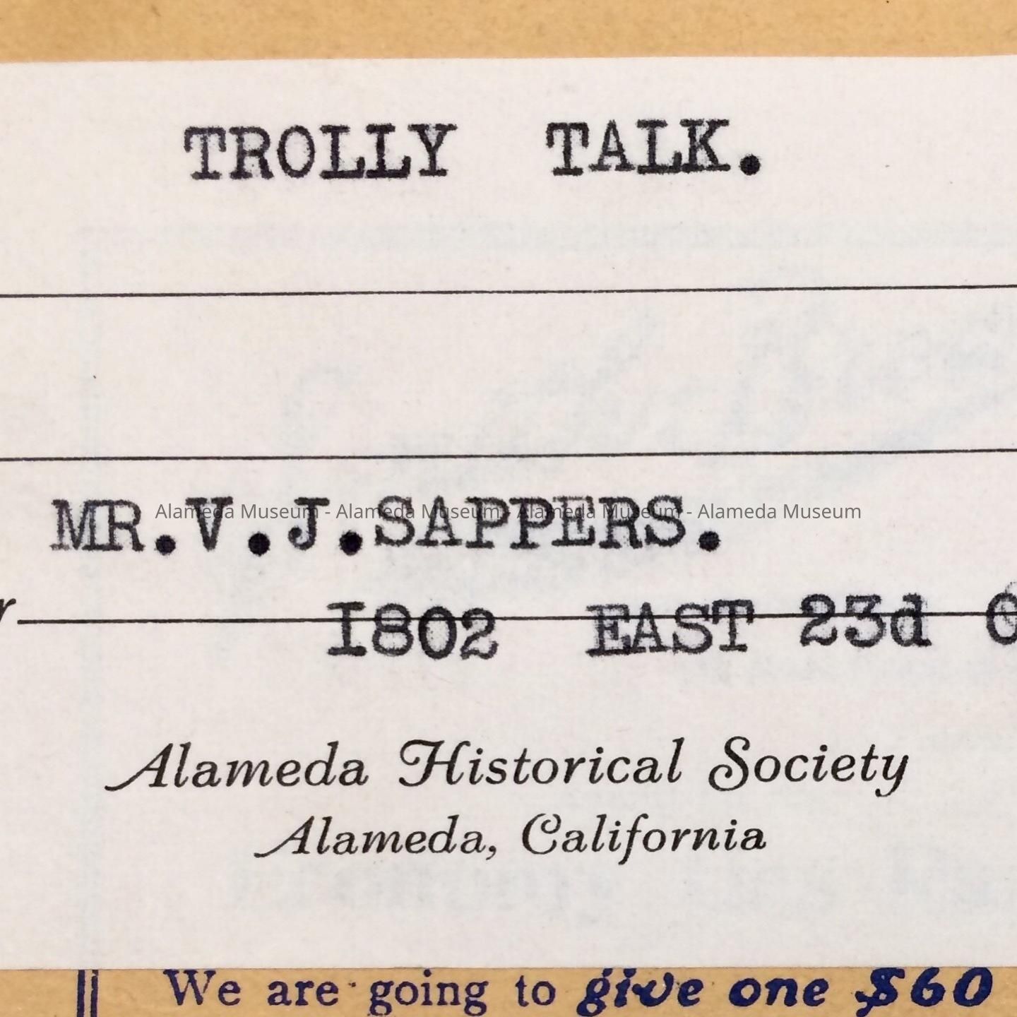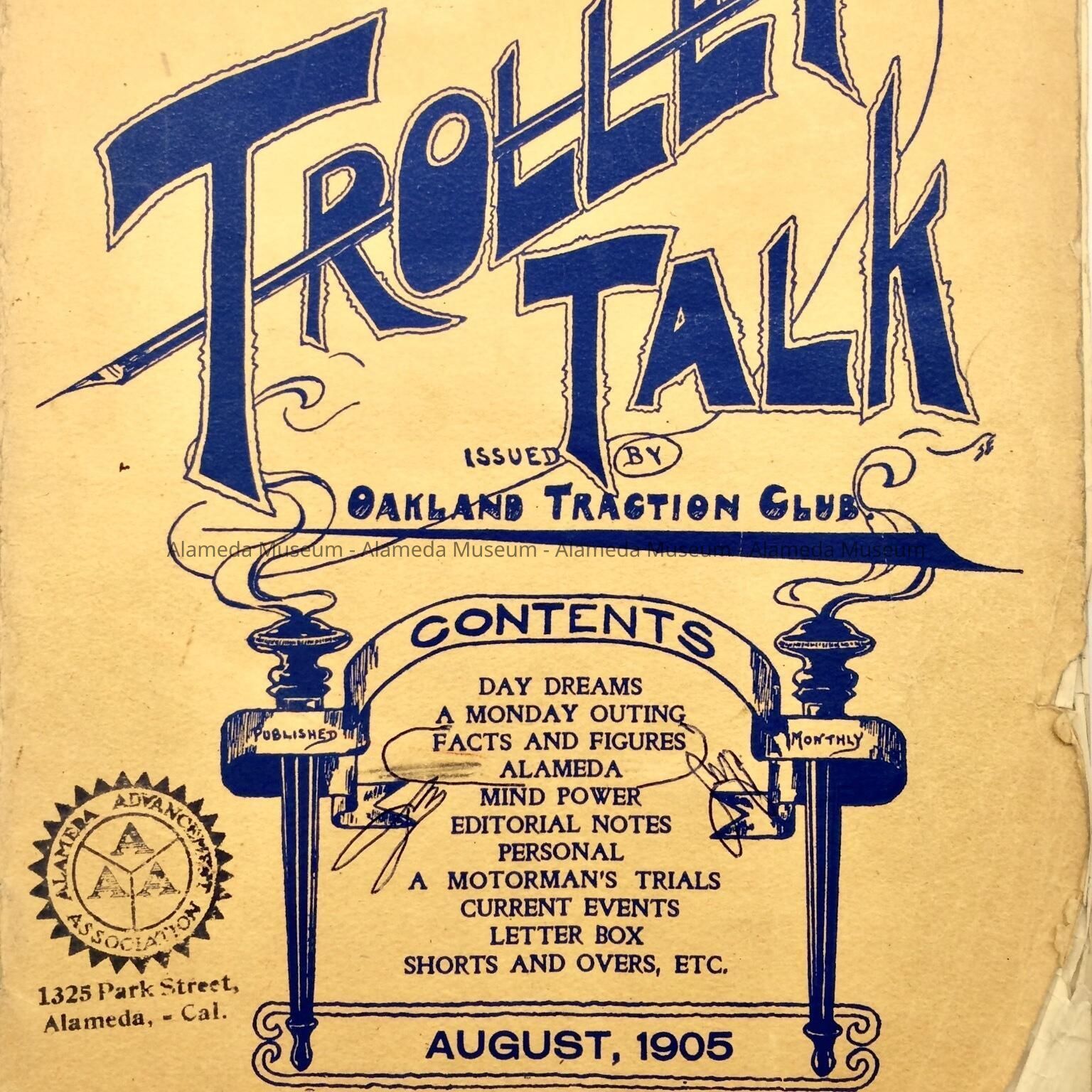 Description: a soft cover booklet with a cover design in blue ink featuring "Trolley Talk" heading on the front cover, together with a table of contents and other information. A black rubber stamped logo (abt.1 1/2" diam.) of the "Alameda Advancement Association" appears at the lower left margin of the cover. Page 4/5 is detached, and the lower right corner of the front cover is missing. Advertisements appear on the back and the inside covers, and occasionally throughout the booklet.