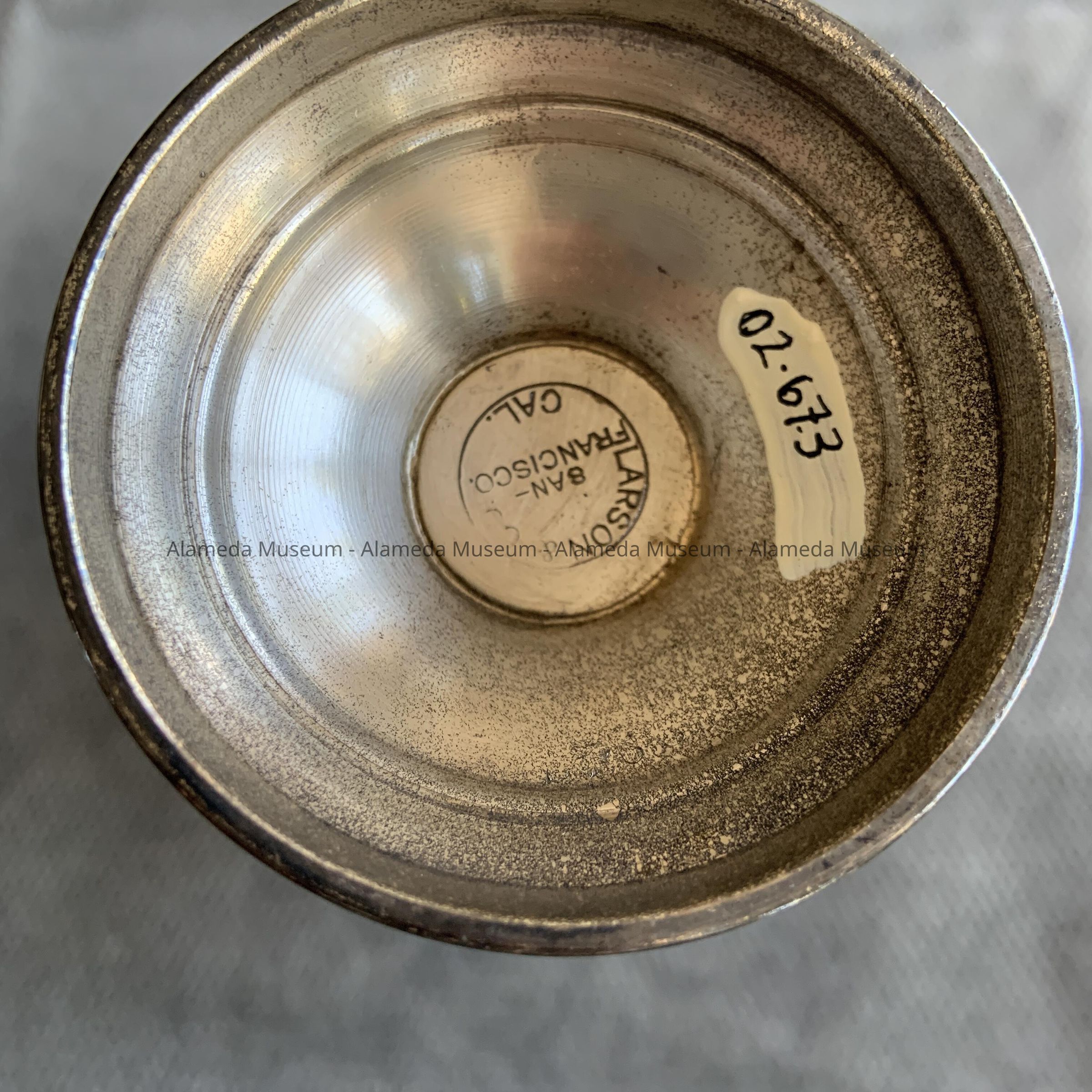 A DOUBLE-HANDLED SILVER-PLATED TROPHY, WITH PEDESTAL BASE. BASE IS SIGNED, "LARSON & CO., SF, CAL."