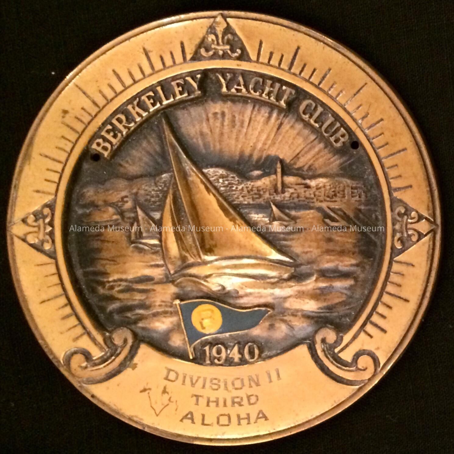 Description: Circular copper plaque, with outer rim engraved with radial lines and triangles giving the look of a compass. Inside Circle is an image of sailboats with a background of hills with a prominent tower, above this is engraved: 'Berkeley Yacht Club', underneath a flag, and '1940', and underneath this, 'Division 11, Third, Aloha'.