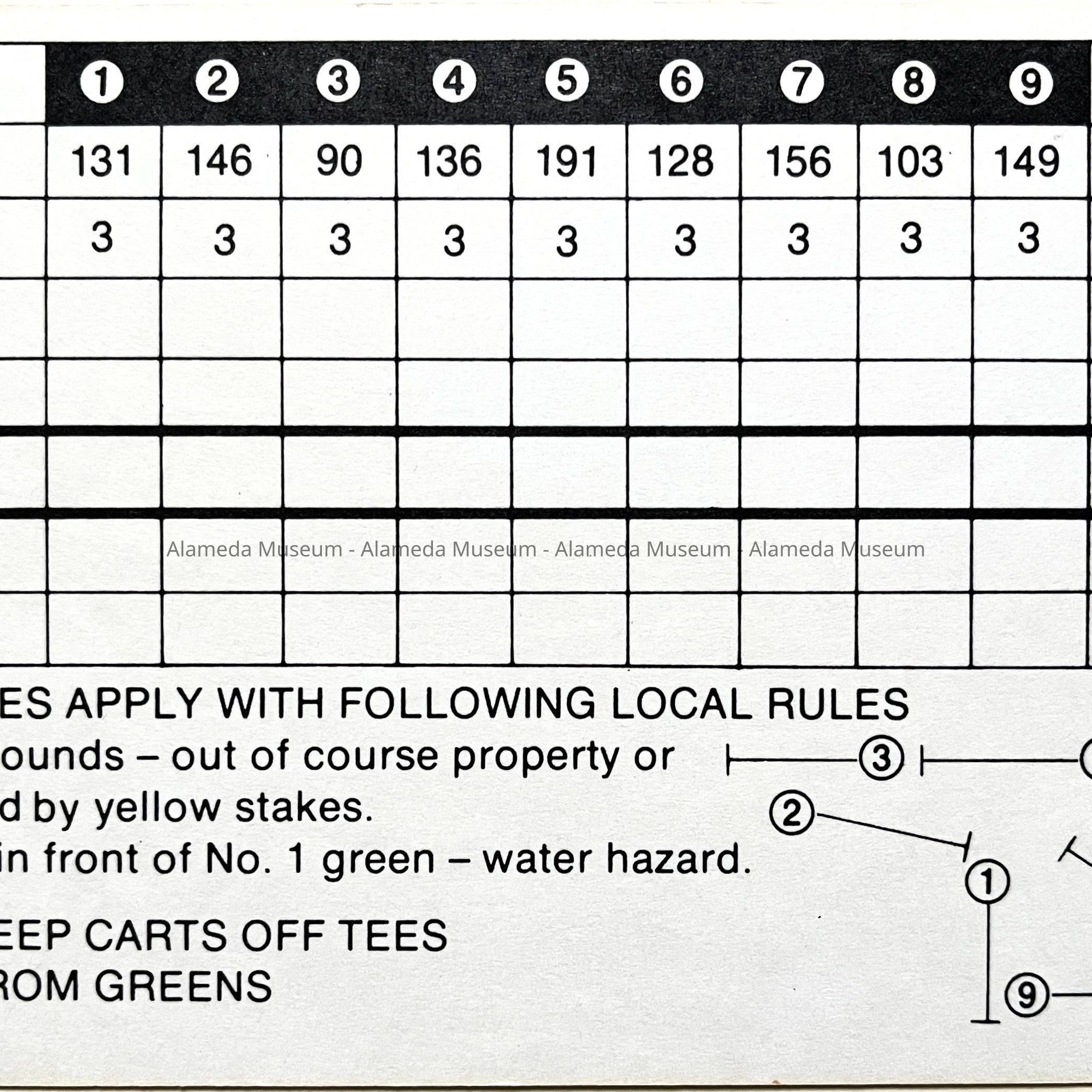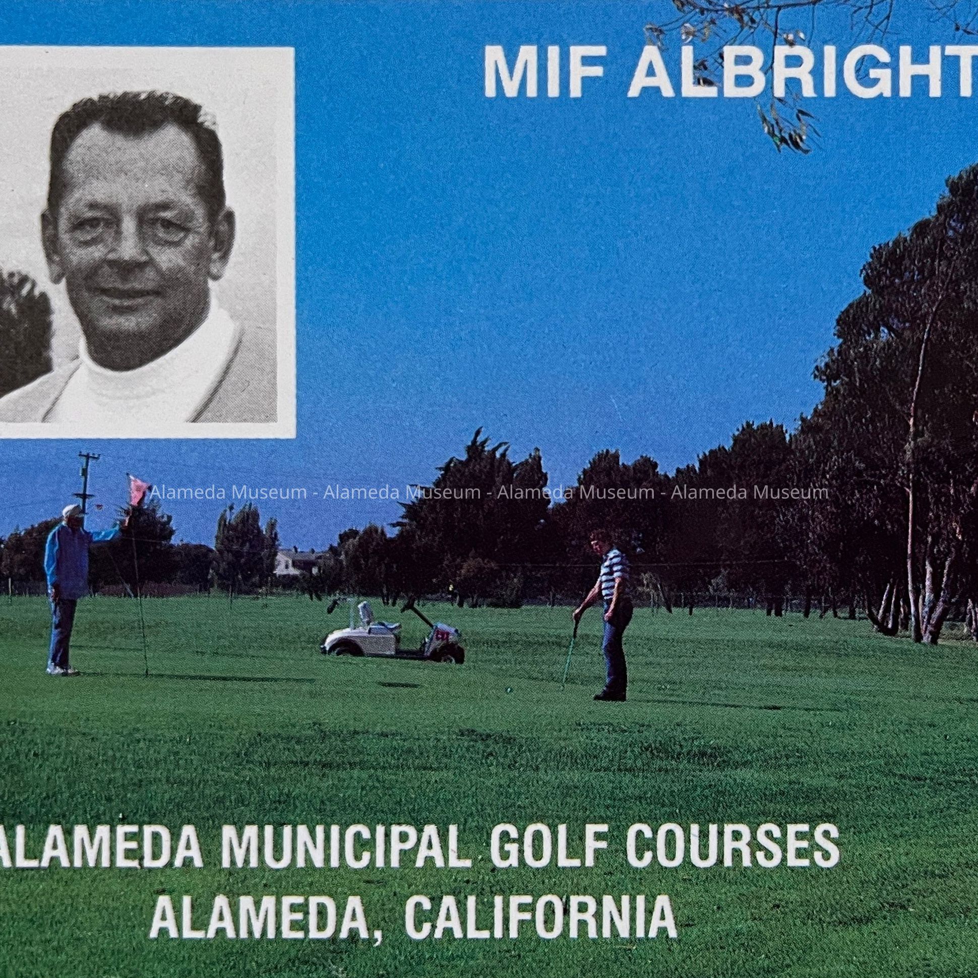 Description: color postcard with insert of a black-and-white head-shot photograph, title in white type, ‘MIF ALBRIGHT COURSE / ALAMEDA MUNICIPAL GOLF COURSES / ALAMEDA, CALIFORNIA’. Verso has a scoring card.