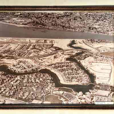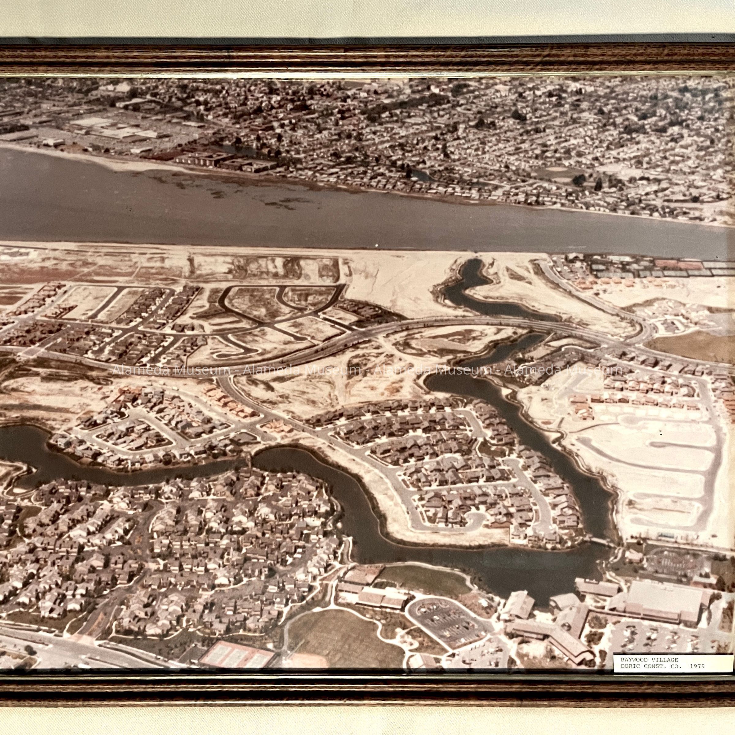 History of Object: Framed aerial photos of real estate developments on Bay Farm Island that were presented to Judge George E. McDonald.
