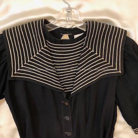 Description: Two-piece black & white bathing suit (bloomer type with skirt), made of heavy woolen broadcloth.Full length suit (to gathered knees), with 6 buttons from neck to navel. Bertha collar, gathered sleeves, skirt waistline band and hem are trimmed with white cording. Skirt (detachable) is secured by buttons to the waist of the main suit. Skirt has a white clothing label which states in ink "A. Lowenstein-Box11". The main section of the bathing suit has no clothing label other then an appliqued "A" on the nape of the garment.