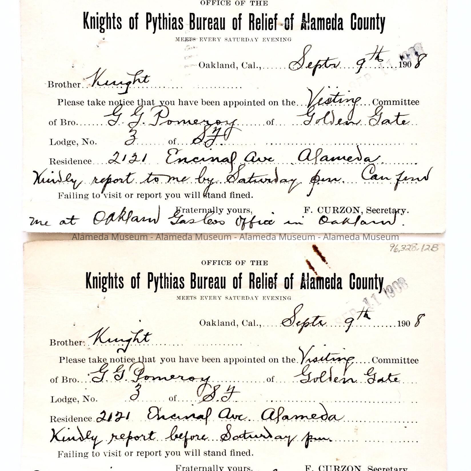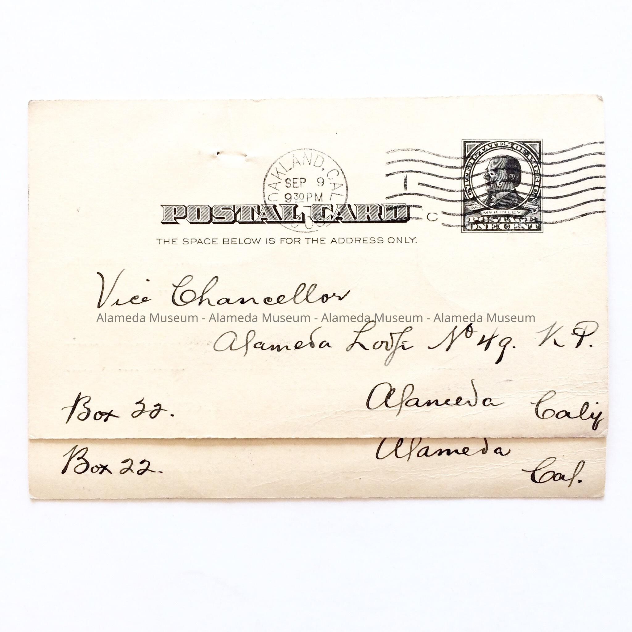 TWO POSTAL CARDS ADDRESSED TO THE VICE CHANCELLOR, ALAMEDA LODGE #49, KNIGHTS OF PYTHIAS, REQUESTING THAT HE ATTEND A MEETING.