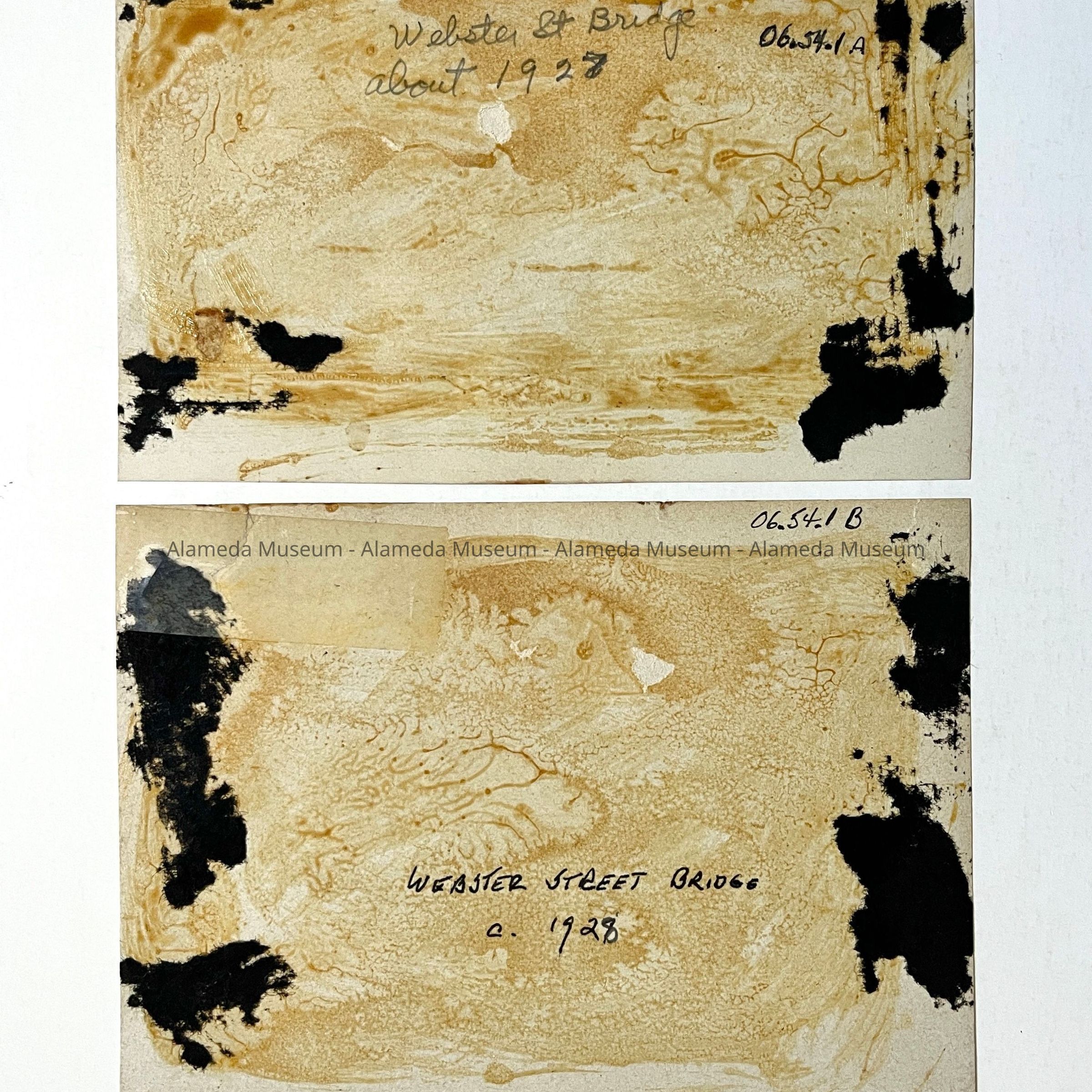 History of Object: Two views of the Webster Street Bridge that collapsed in the estuary as part of its demolition procedure. The Posey Tube had been opened in 1928.