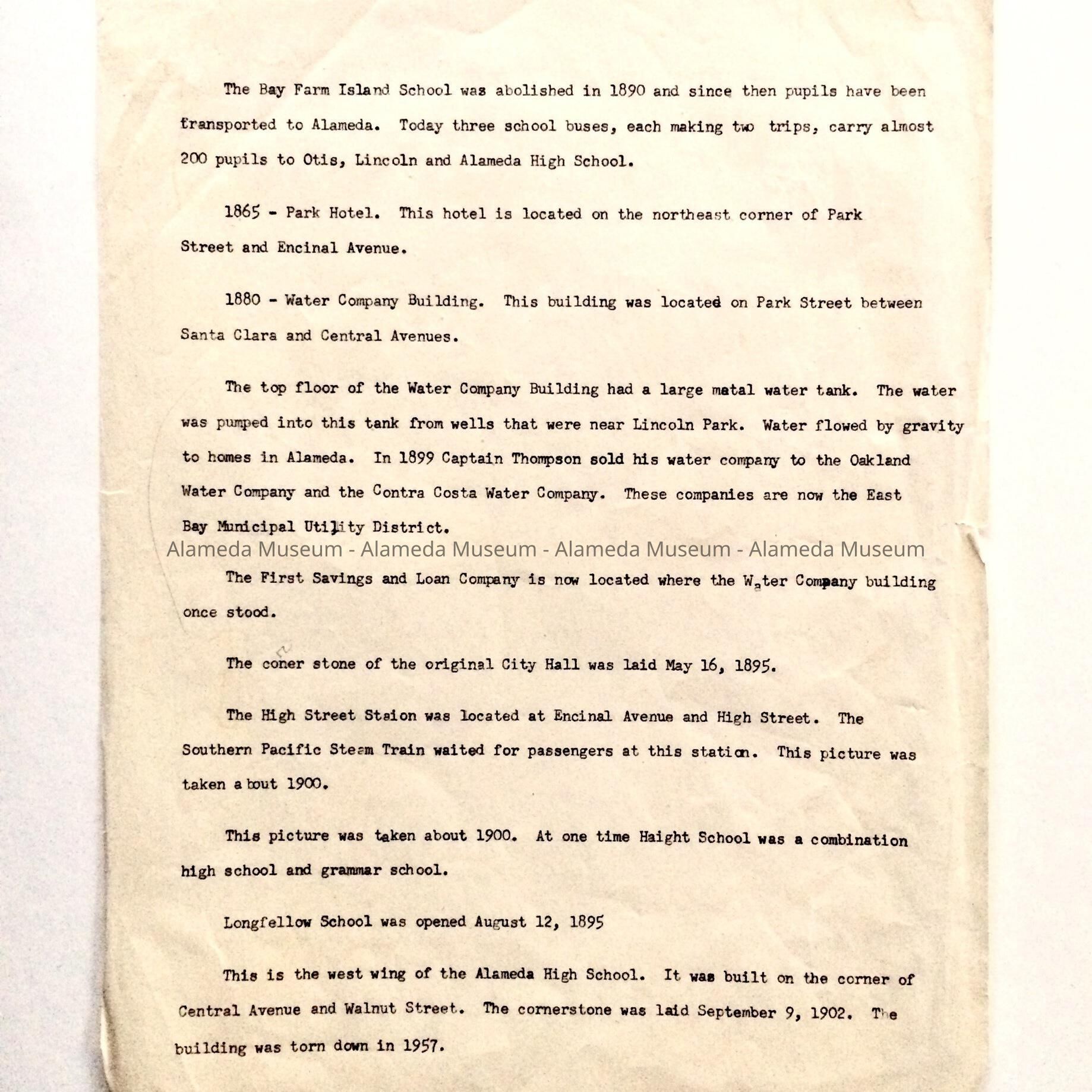 History: One page article written about historical events of the City of Alameda and might have accompanied photographs or a slide show since it mentions various subjects on a single page.