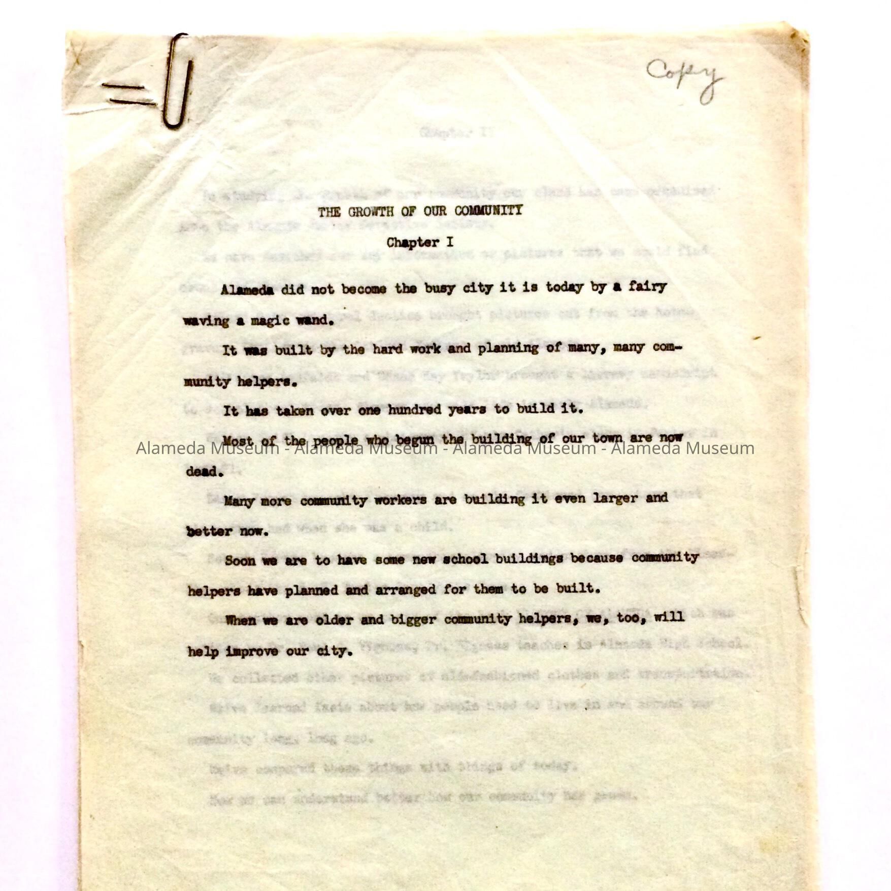 History: Segments of a possible book concerning the history of Alameda, which was compiled by a teacher at Porter School. The article refers to different periods of the City's development including the Fire Department, City Hall, etc.