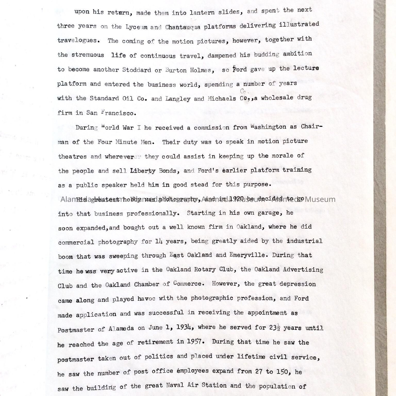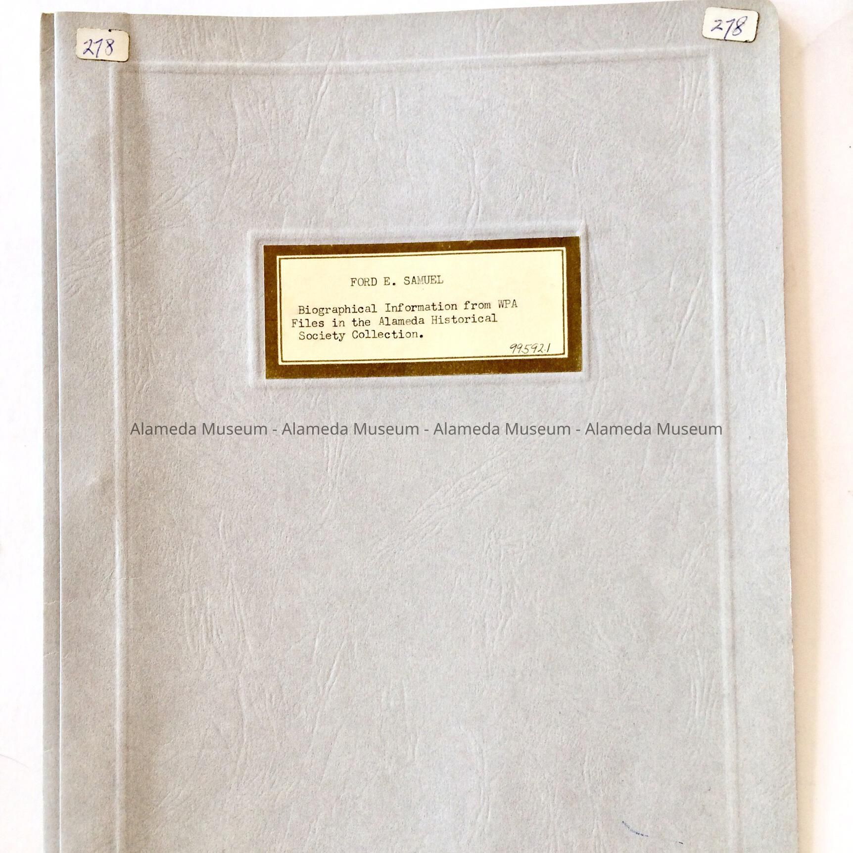 Description: Original copy of a four (4) page typewritten biography contained in a gray colored paper loose leaf folder. Cover has typewritten caption "Ford E. Samuel".
