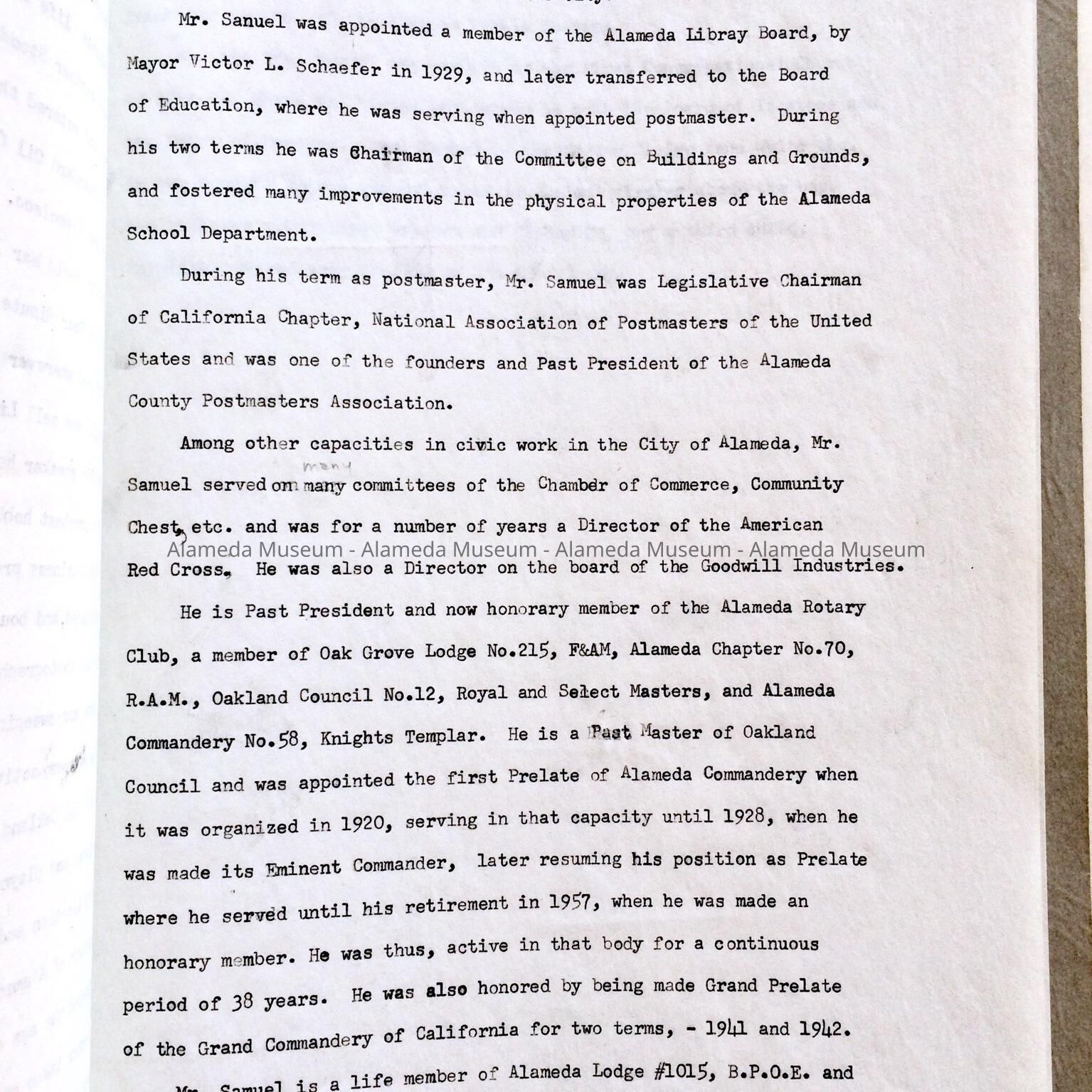 History: Biographical sketch of the late Ford E. Samuel, Post Master of the City of Alameda.