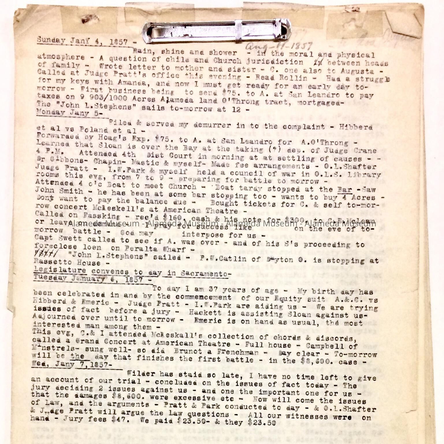 History: Diary of William Worthington Chipman, co-founder of the City of Alameda, January 4 - August 11, 1857.