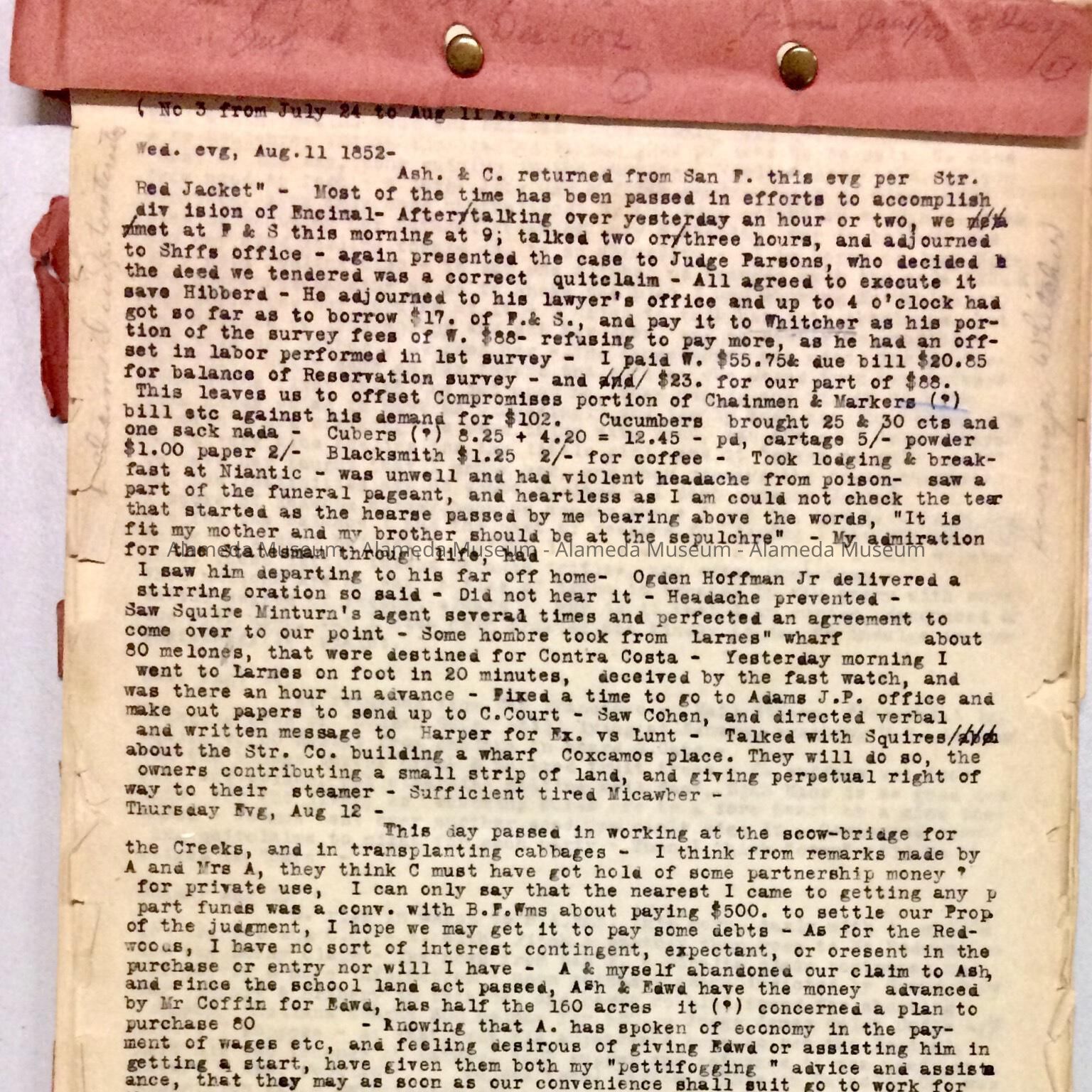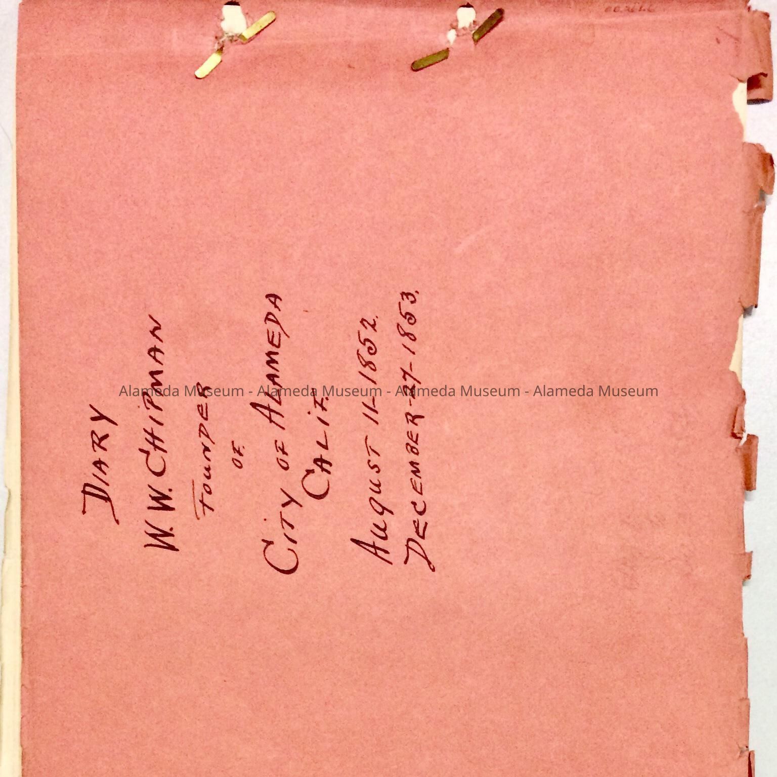 History: Reproduced copy of the diary of William Worthington Chipman, co-founder of the city of Alameda, from August 11, 1852 - December 27, 1853. The diary contains much information on the founding of the city of Alameda.