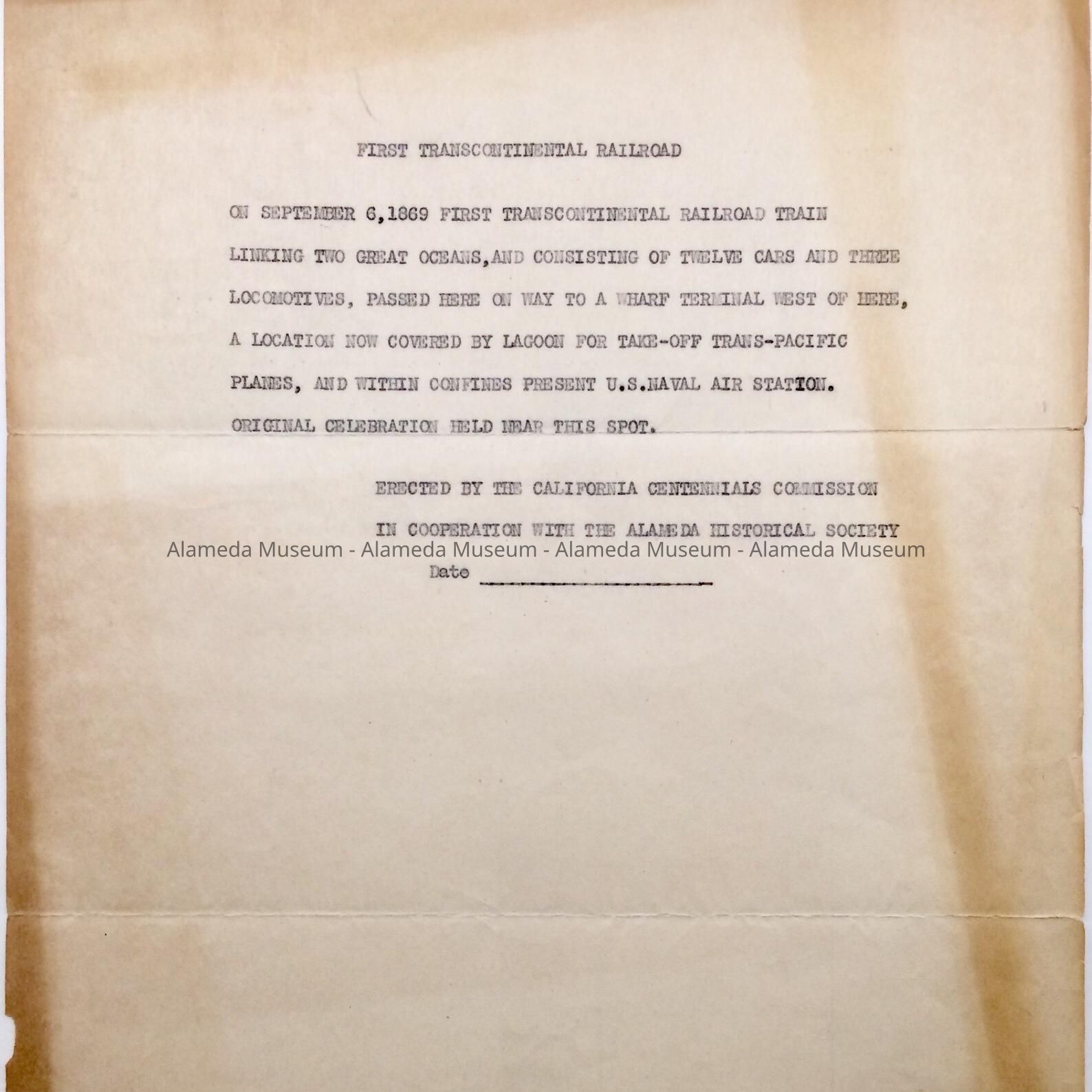 Copy of the inscription from the plaque located at Lincoln and Webster Street commemorating the Transcontinental Railroad's arrival in Alameda September 6, 1869. Believed to have been part of the City records.