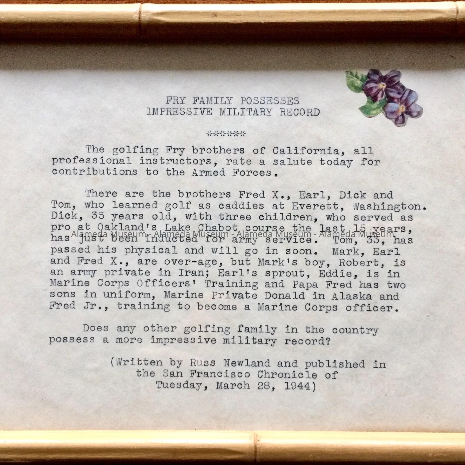 A TESTIMONIAL THAT ORIGINALLY APPEARED IN THE SAN FRANCISCO CHRONICLE ON MARCH 28, 1944. IT CONCERNS THE FRY BROTHERS, AMONG WHOM WAS EARL, THE GOLF PRO AT THE ALAMEDA MUNICIPAL GOLF COURSE FOR MANY YEARS. THE TESTIMONIAL REFERS TO THE MILITARY SERVICE RECORDS OF THE BROTHERS DURING WW-II.