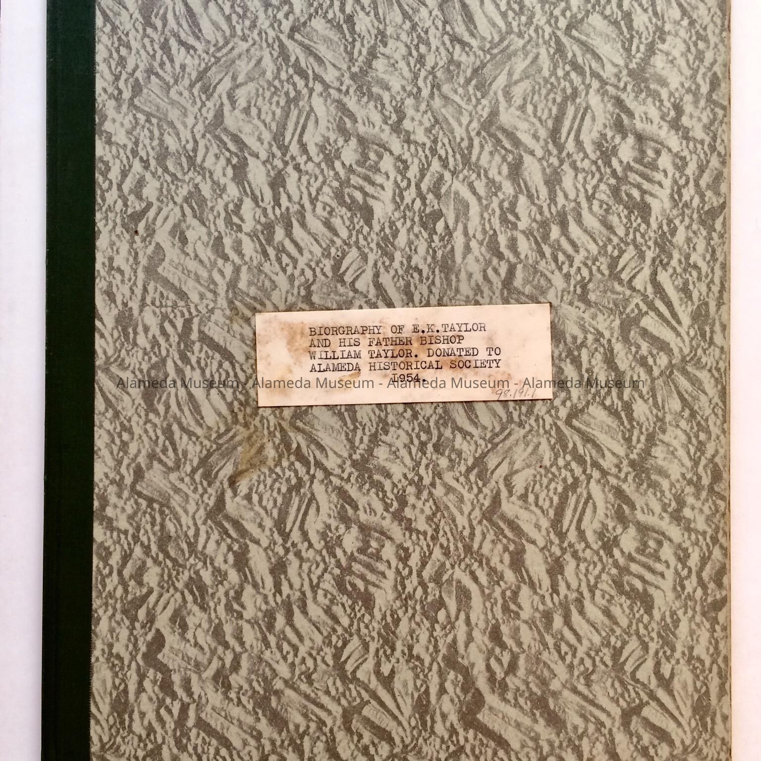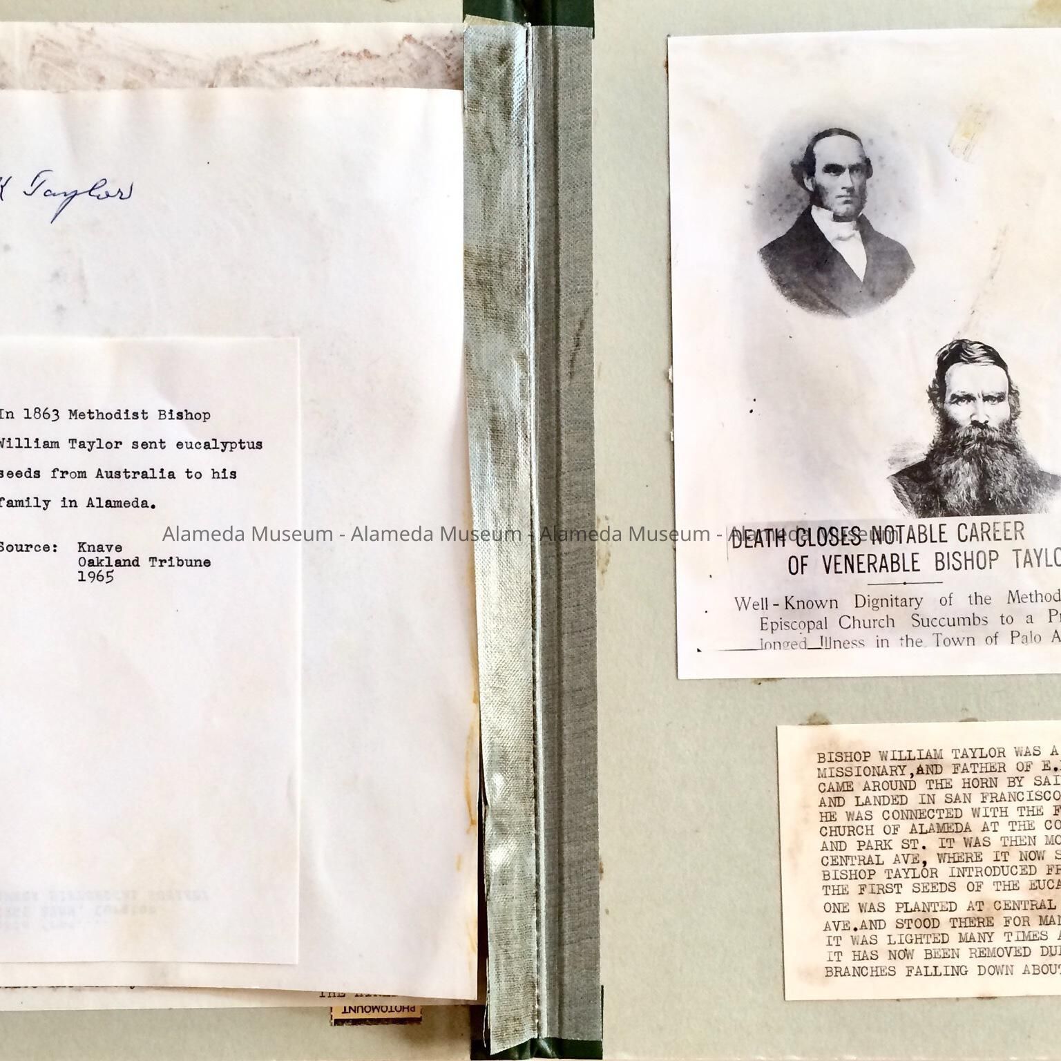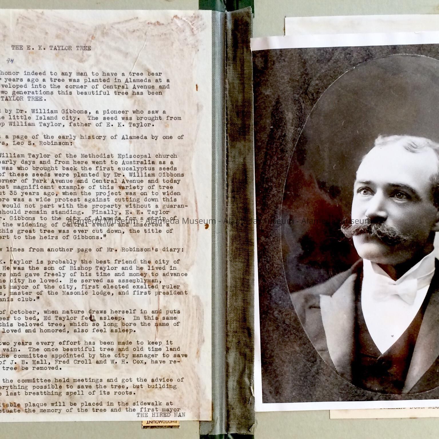 TYPEWRITTEN HISTORY OF THE TAYLOR EUCALYPTUS TREE THAT STOOD AT THE SOUTHEAST CORNER OF PARK AND CENTRAL AVENUES IN ALAMEDA, CA. THE TREE WAS ORIGINALLY PLANTED BY DR WILLIAM GIBBONS IN HONOR OF BISHOP WILLIAM TAYLOR. THE SCRIPT ALSO INCLUDES A BLACK-AND-WHITE PHOTOGRAPHIC COPY OF A PORTRAIT OF EK TAYLOR, SON OF WILLIAM, LATER MAYOR ALAMEDA. ALSO INCLUDED IS COPY OF A PHOTOGRAPHIC PORTRAIT OF BISHOP WILLIAM TAYLOR. OBJECT WAS DONATED TO THE ALAMEDA HISTORICAL SOCIETY IN 1954 AND NOT OFFICIALLY CATALOGED AT THAT TIME.