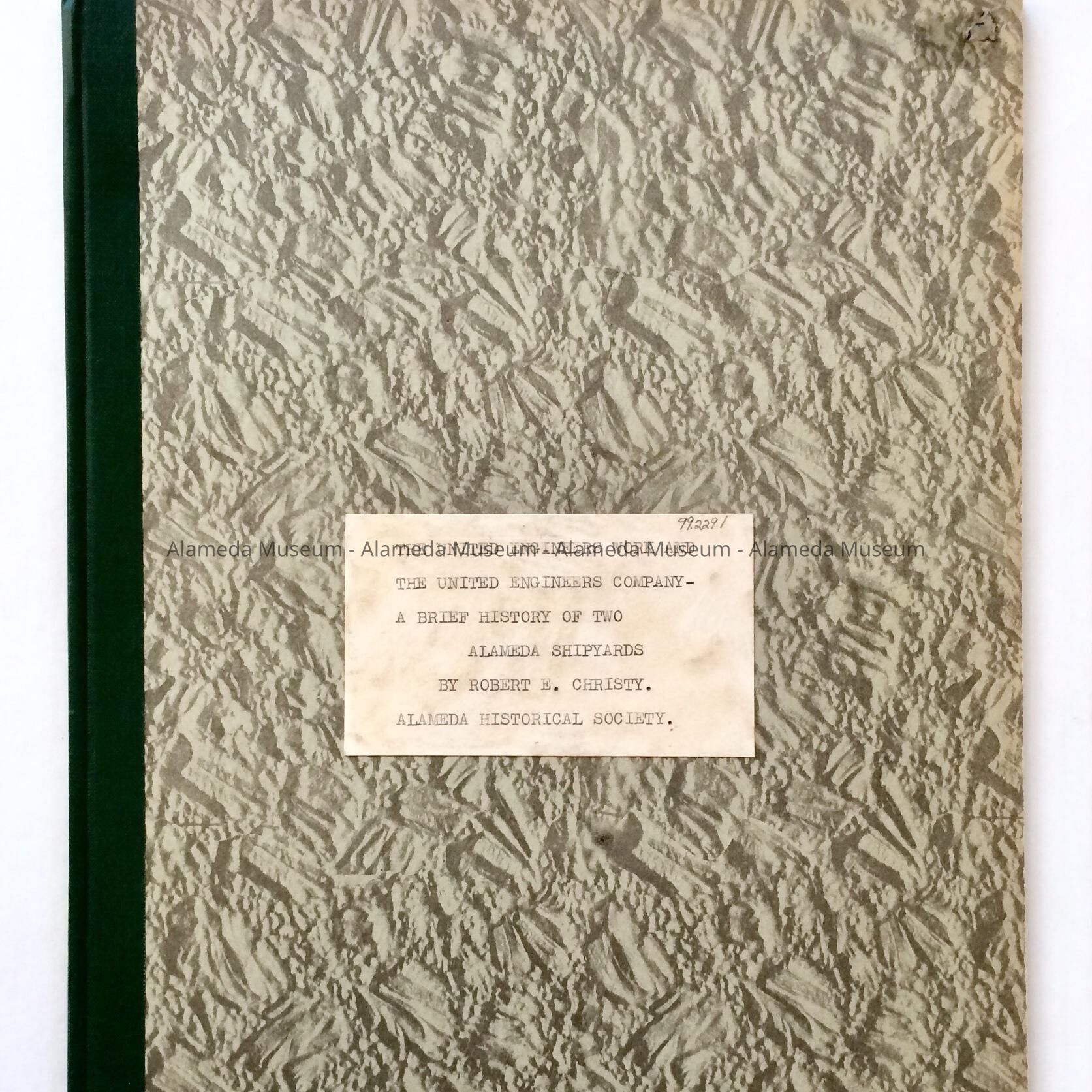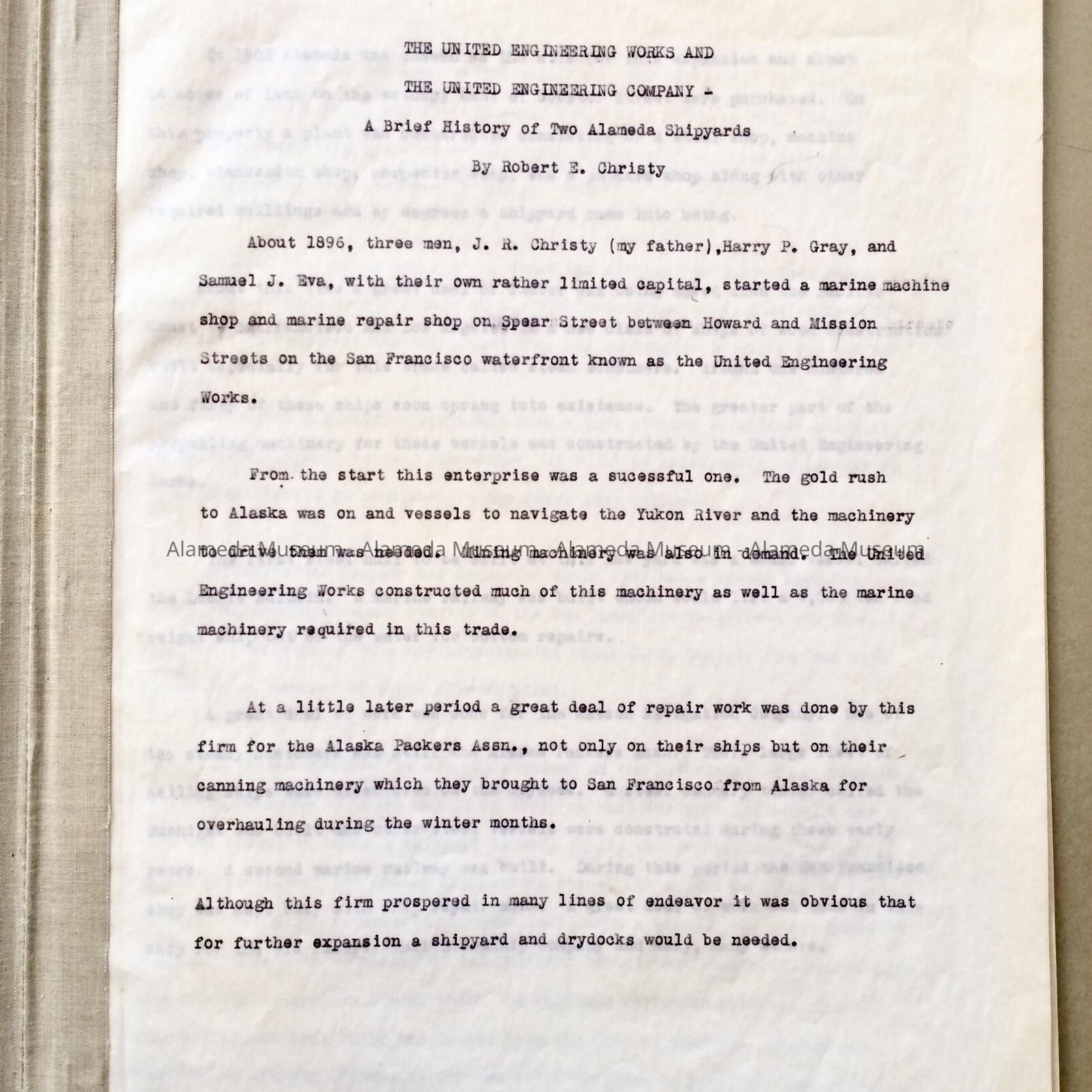 History: Four (4) page typed history of the United Engineering Works and the United Engineering Company, a brief history of two (2) Alameda shipyards by Robert E. Christy. The company was sold to the Matson Navigation Company in 1945 and later leased to Todd Shipyard Corp. Given prior to 1971 and never catalogued.