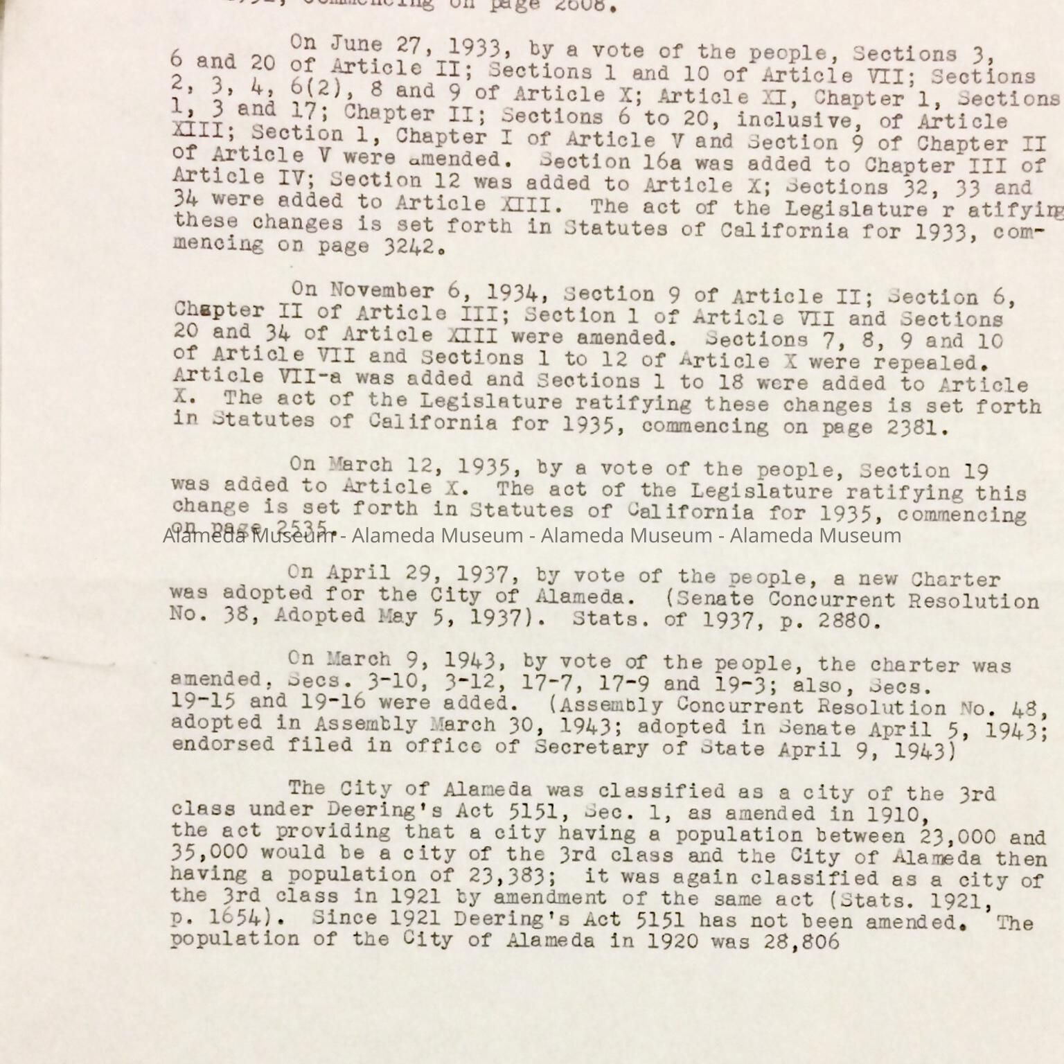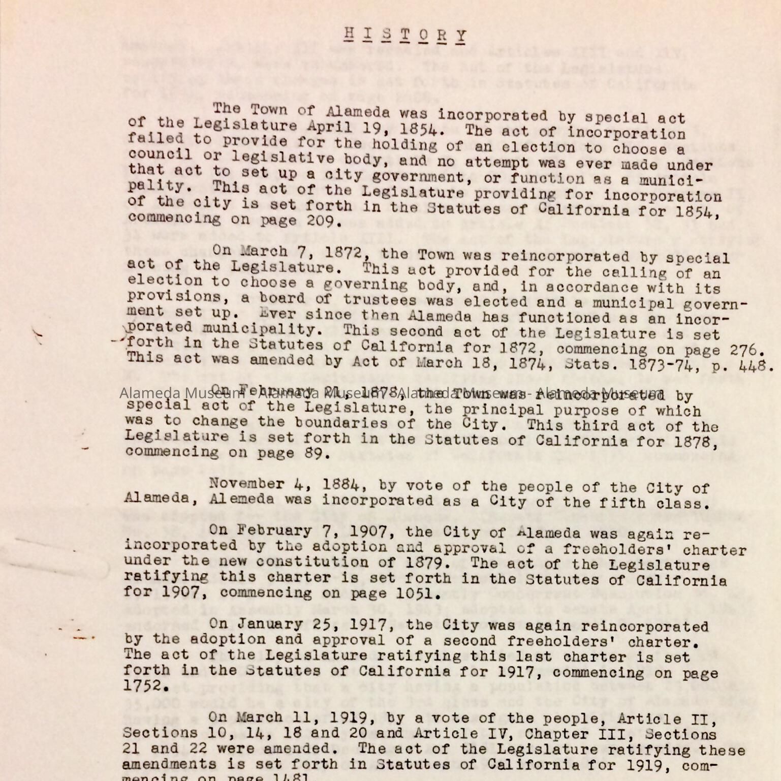 Description: An original typed copy of a history, done on legal-sized sheets of paper, of the City of Alameda for the period of 1854 to 1943.