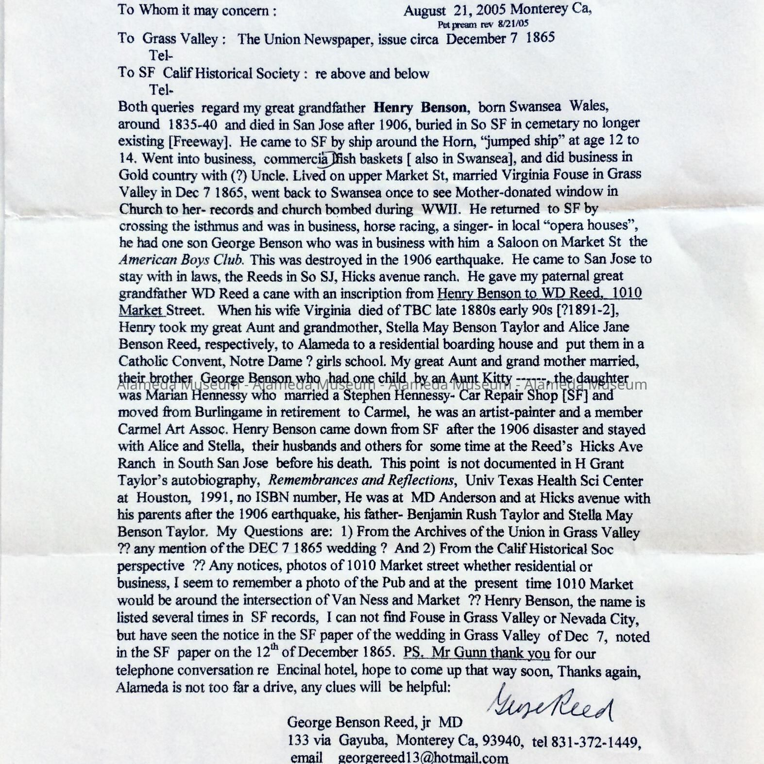 Typed letter about Henry Benson, 2005Entry/Object ID