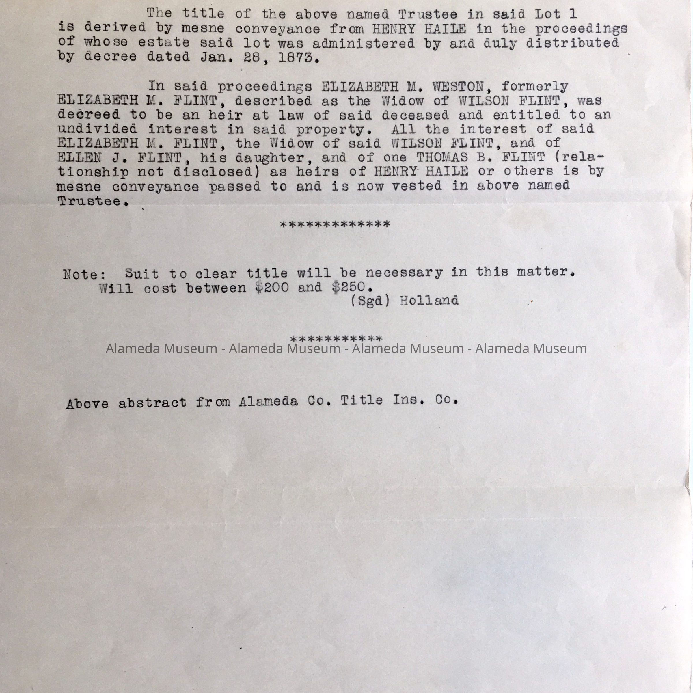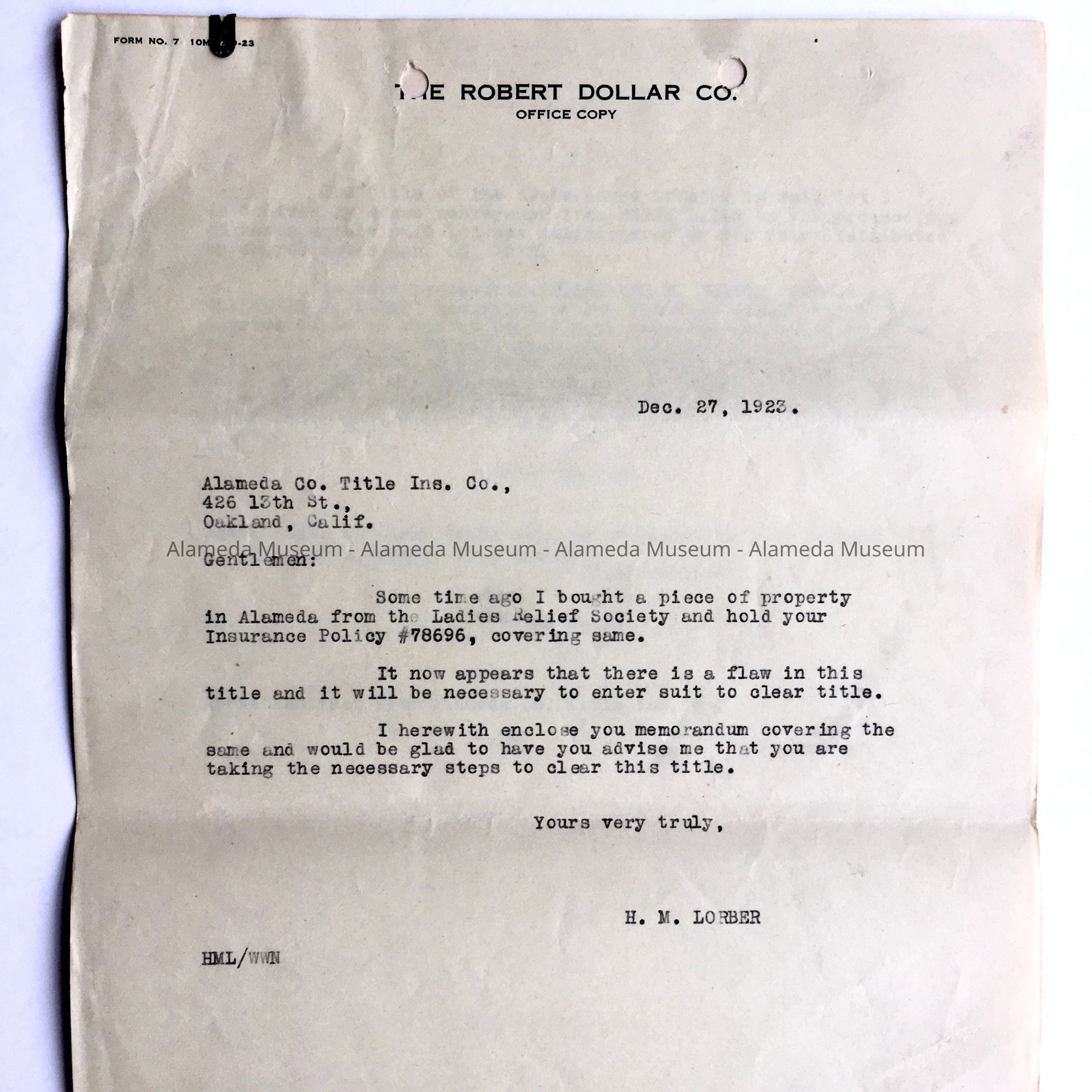 LETTER ADDRESSED TO ALAMEDA COUNTY TITLE INSURANCE COMPANY, OAKLAND, CALIFORNIA, CONCERNING AN INSURANCE POLICY ON PROPERTY LOCATED IN ALAMEDA.