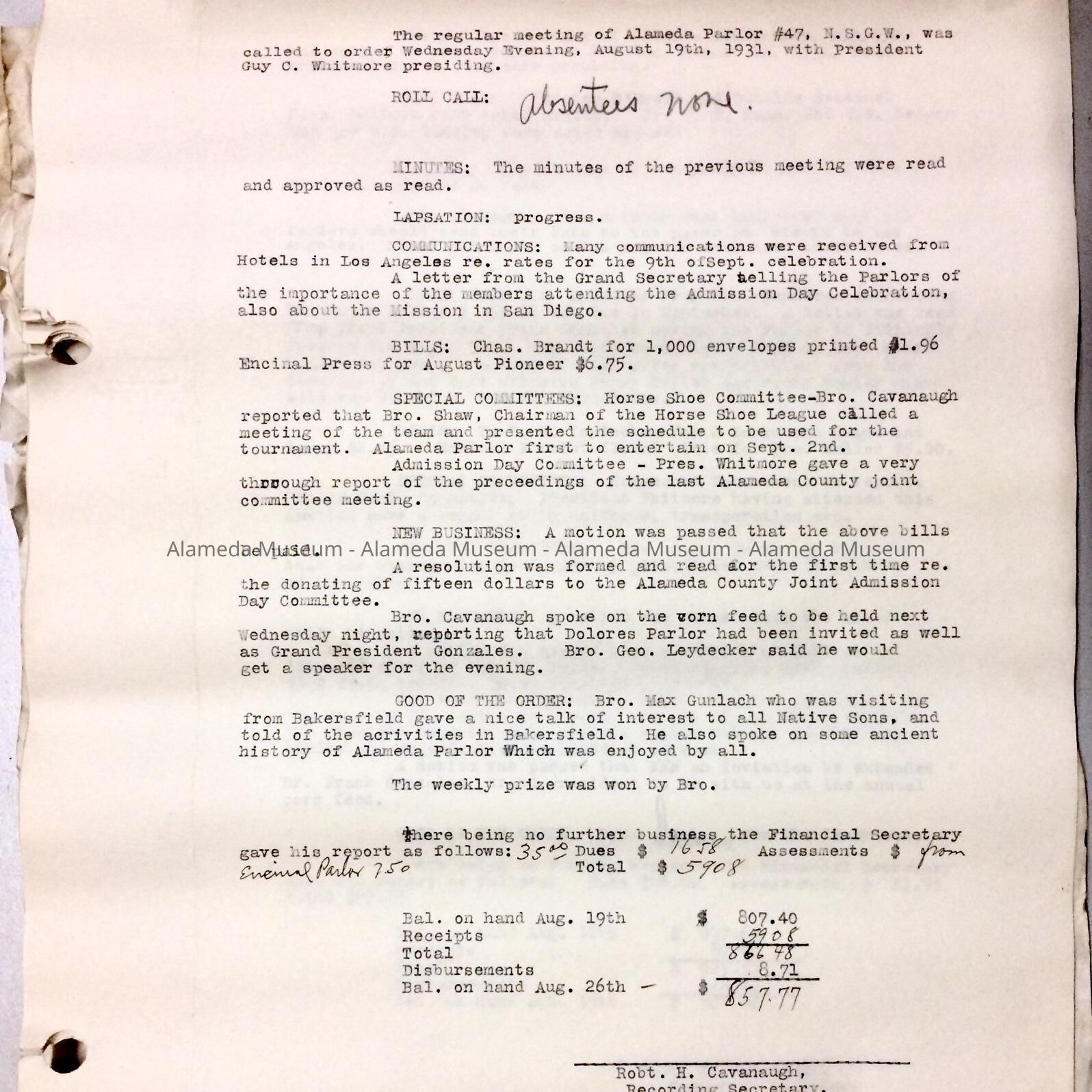 Typed Minutes, Native Sons of the Golden West, Parlor No. 47, 1931Entry/Object ID
