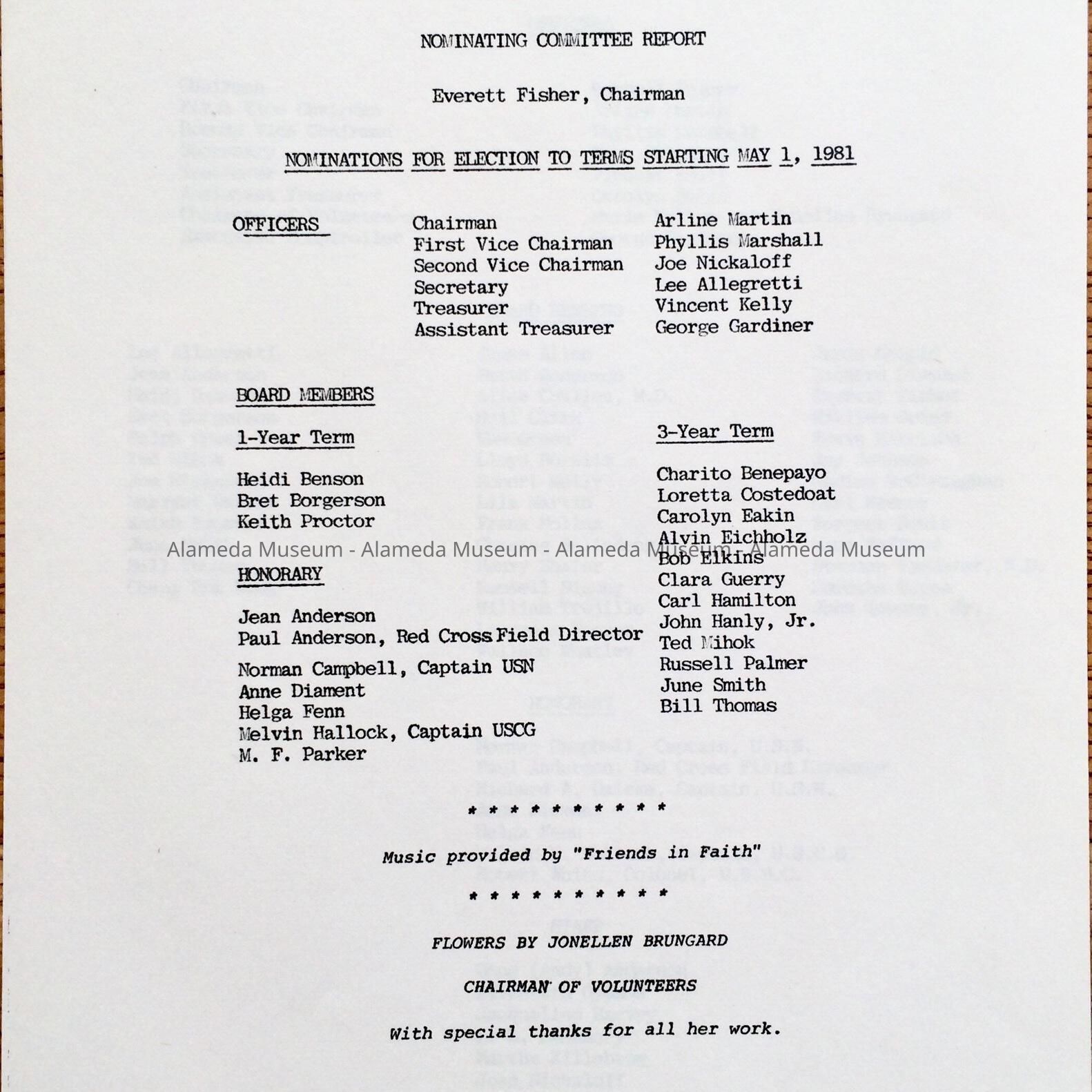 History of Object: A nominating committee report of the Alameda Branch of the American Red Cross for 1981. It enlists offices and board of directors and the former chapter chairman.