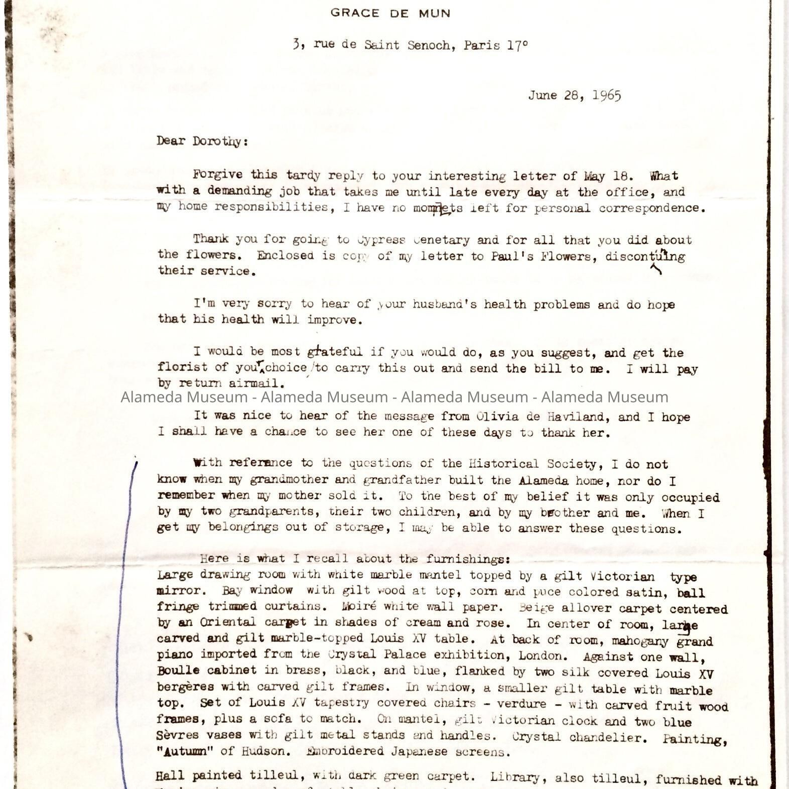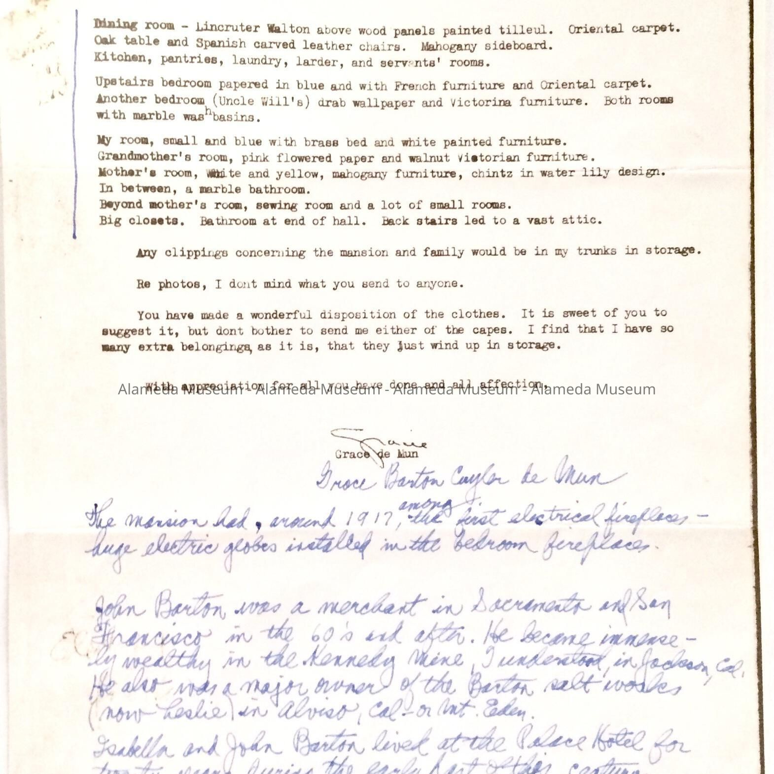 Typewritten Recollections composed by Grace de Mun, granddaughter of John Barton, describing the interior of his mansion which stood at the present site of the Hotel Alameda. Given to the Alameda Museum in 1974 and never catalogued.