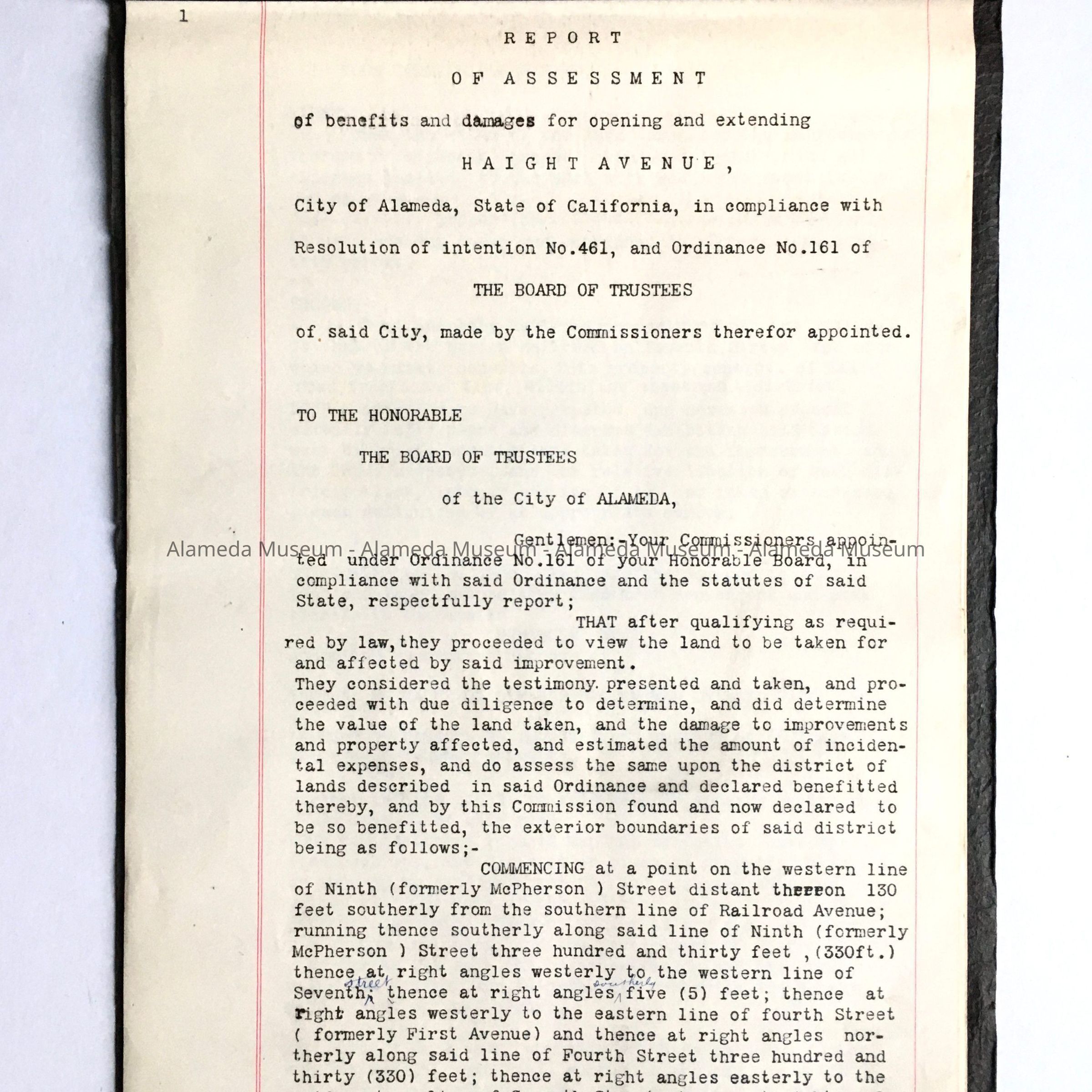 History: Report of Assessment of Benefits and Damages for opening and extending Haight Avenue in the vicinity of Ninth Street. Also lists the names of property owners affected by the opening of Haight Avenue.