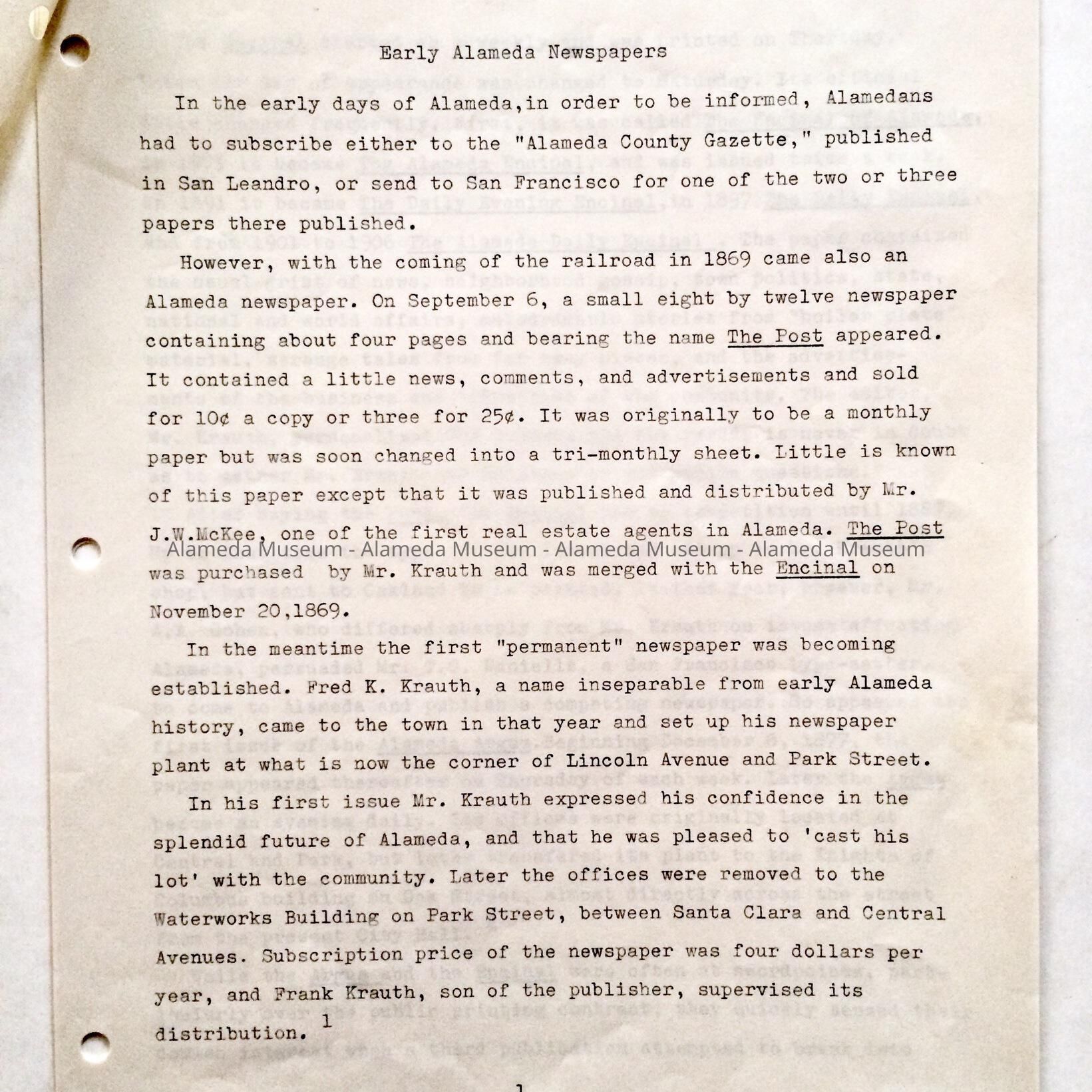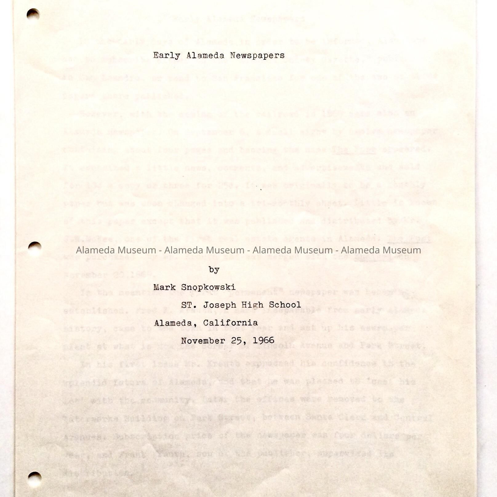 History: Report written by Mark Snopkowski, a student at St. Joseph's High School, and dated November 25, 1966. The report is concerning the history of early newspapers in the City of Alameda including The Post, Encinal, Argus, etc.