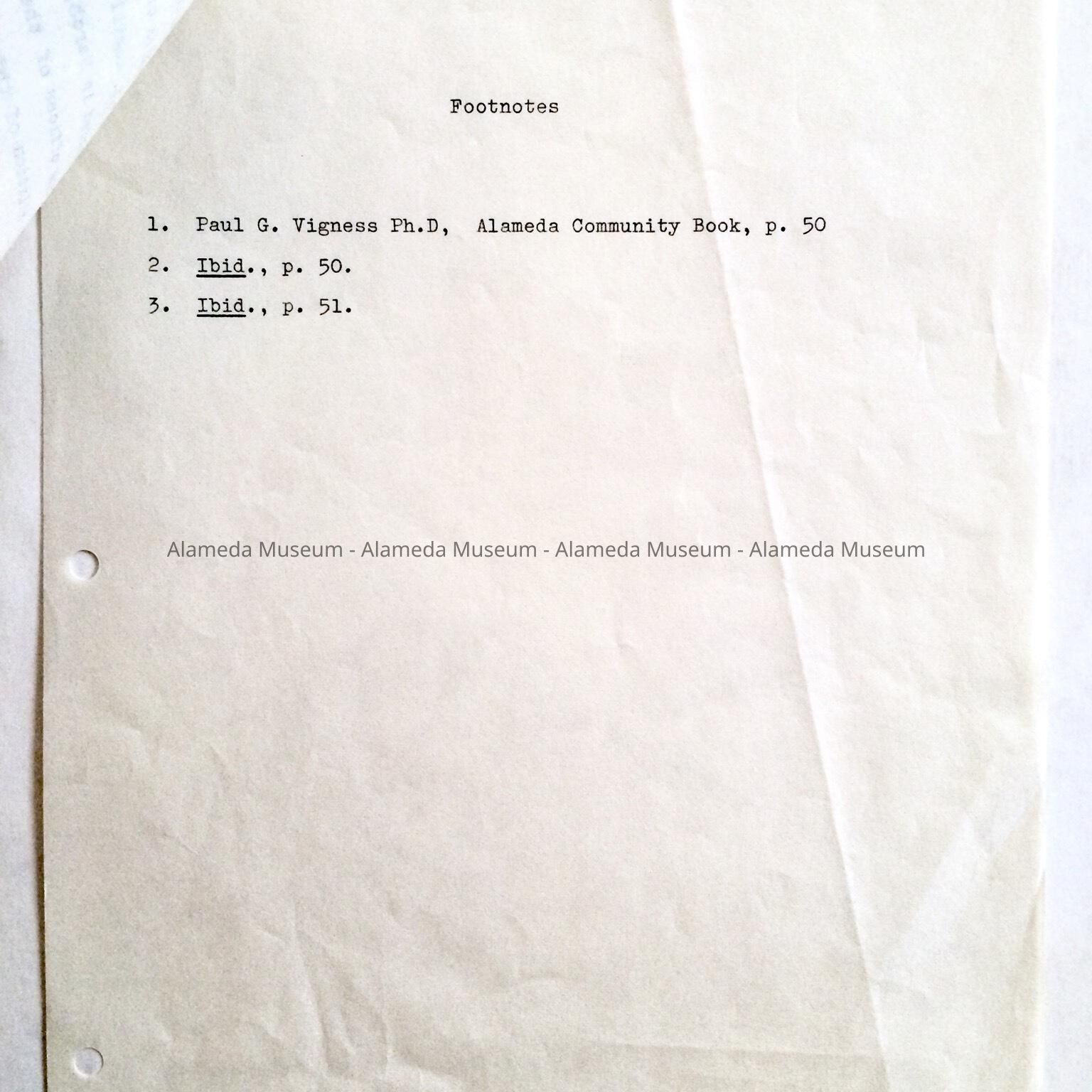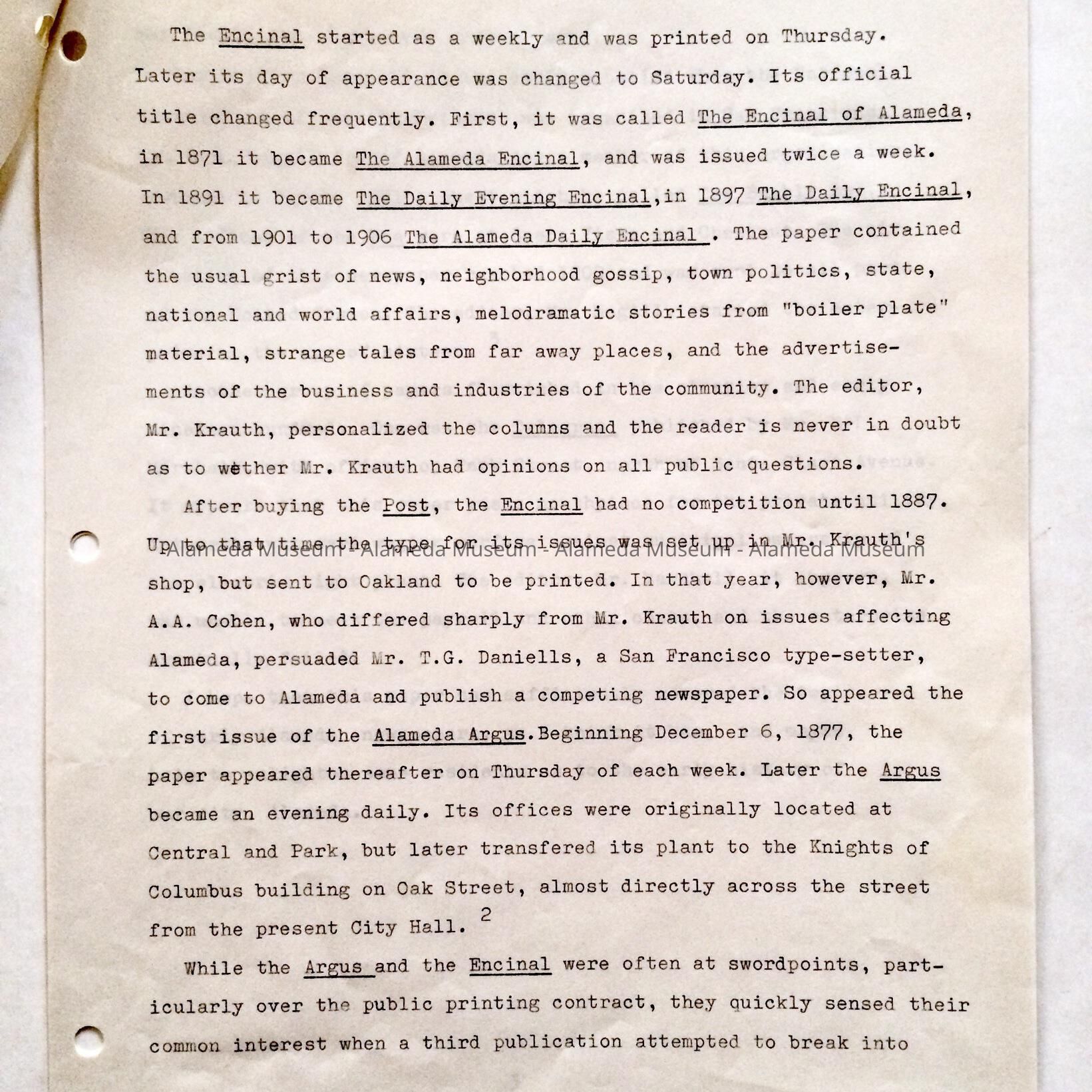 Typed report 'Early Alameda Newspapers', by Mark Snopkowski, 1966Entry/Object ID