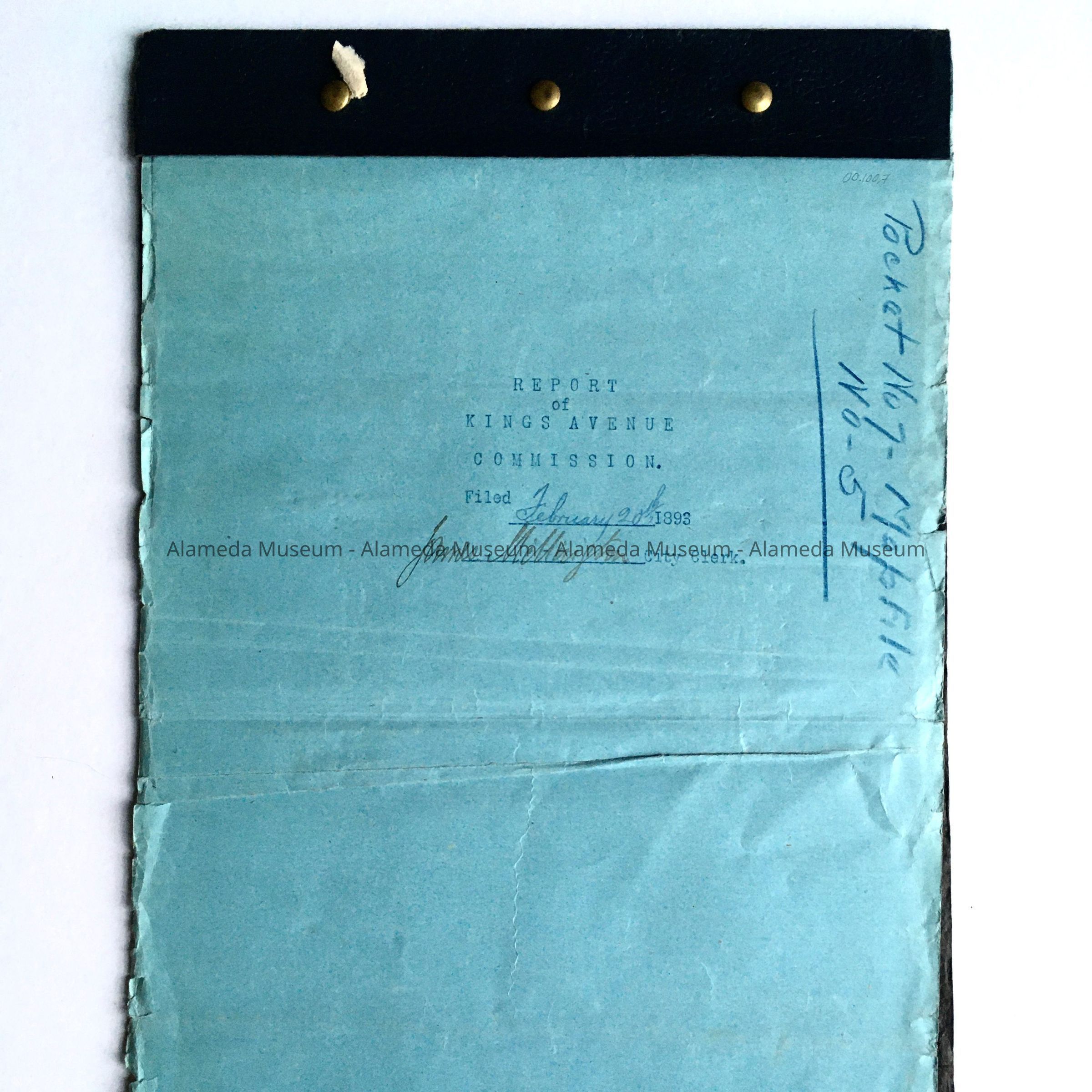 Typewritten report contained in a dark blue colored coverlet. Opening page has bold printed caption "Report of Kings Avenue".
