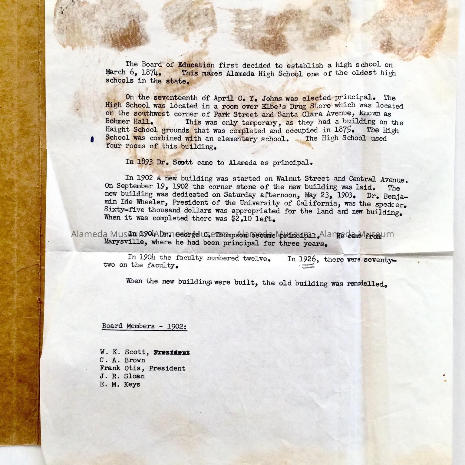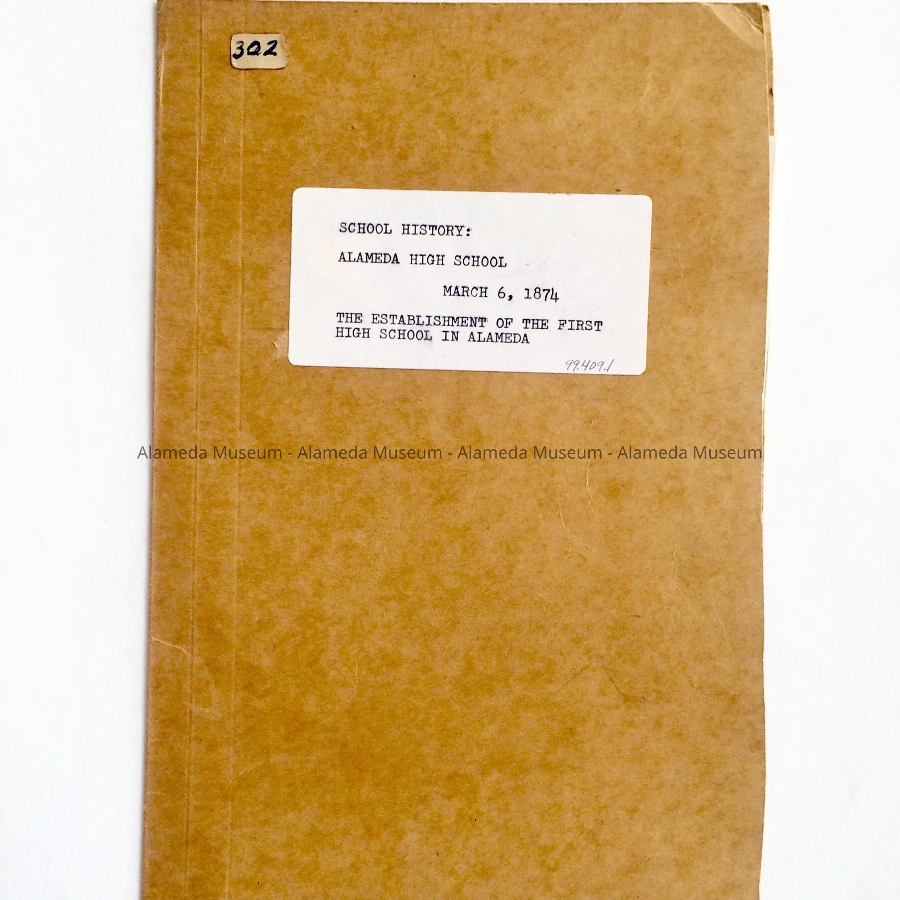 HISTORY OF OBJECT: REPORT ON THE ESTABLISHMENT OF THE FIRST PUBLIC HIGH SCHOOL IN ALAMEDA IN 1874. REPORT CONTAINS NAMES OF EARLY PRINCIPALS, ETC. THE REPORT WAS PRESENTED TO THE ALAMEDA HIGH SCHOOL BY AN UNKNOWN DONOR. #302 AND NOT PREVIOUSLY CATALOGED.