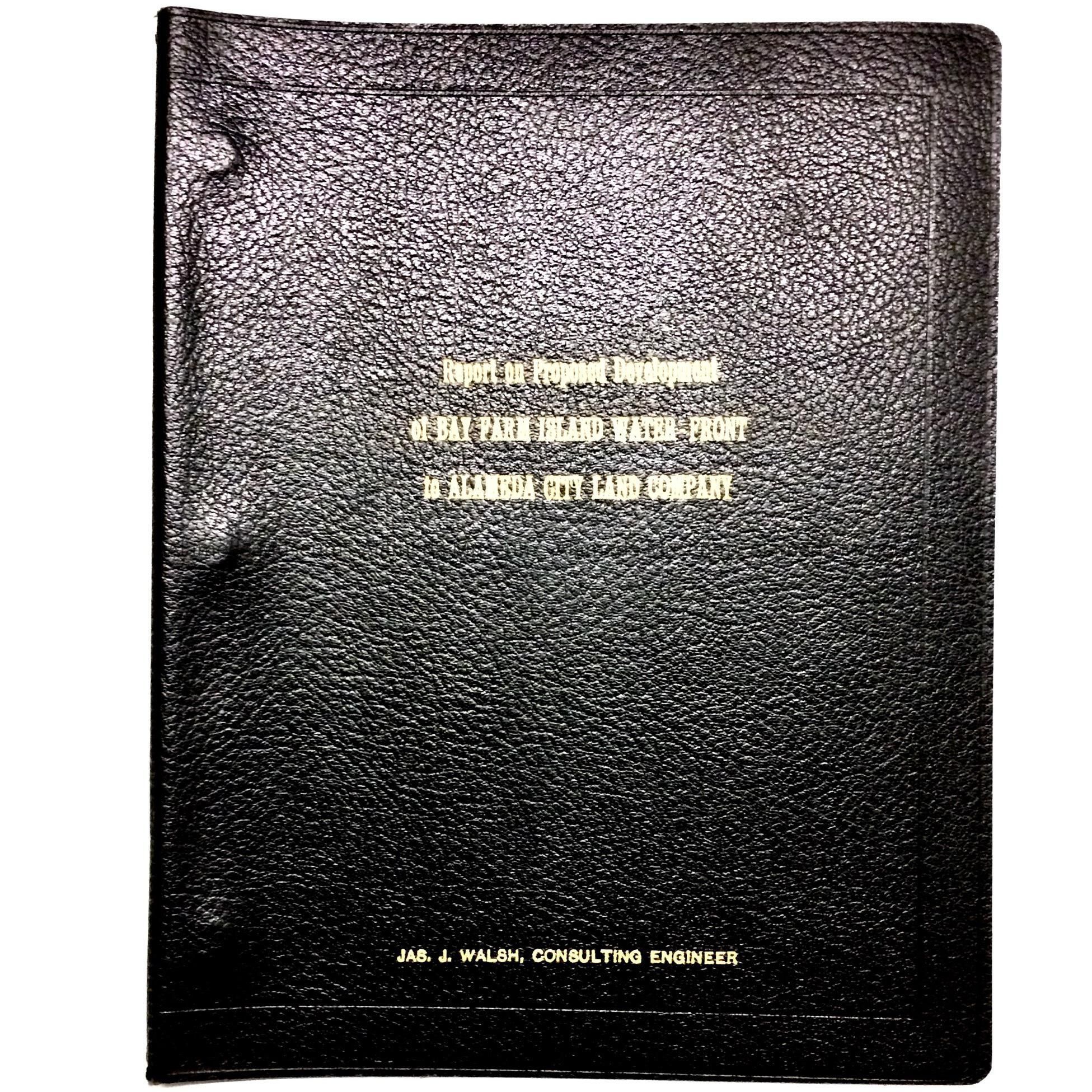 COPY OF A TYPEWRITTEN REPORT HOUSED IN A LOOSE-LEAF BLACKCOLORED IMITATION LEATHER COVER. THE COVER HAS INCISED LETTERING IN GOLD, STATING "REPORT ON PROPOSED DEVELOPMENT OF BAY FARM ISLAND WATERFRONT."