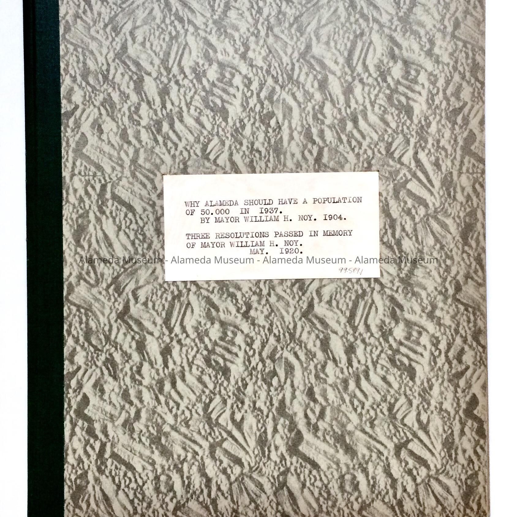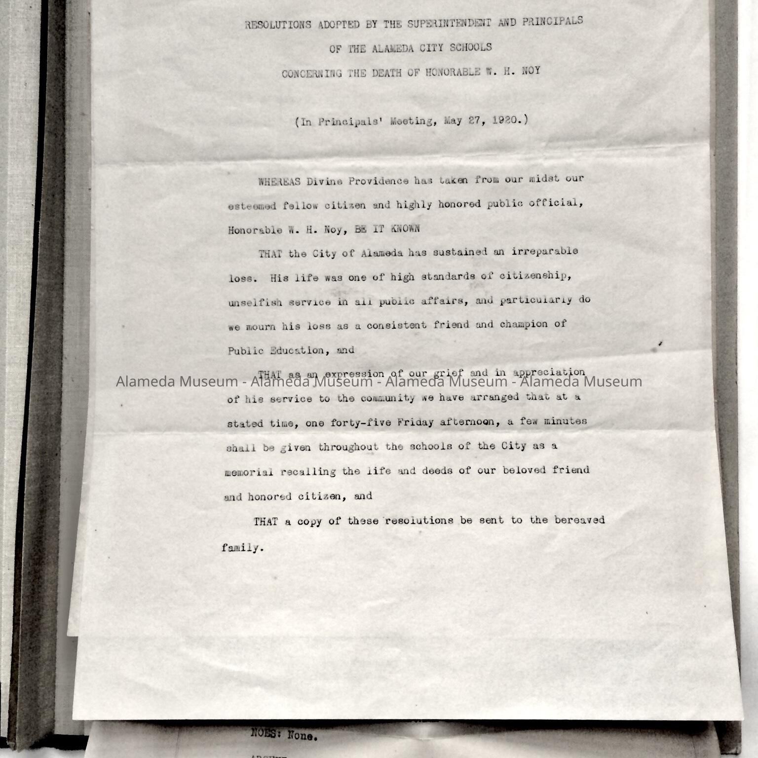 History: Resolution adopted by the Superintendent and Principals of Alameda City Schools concerning the death of W.H. Noy who had served as the Mayor of the City of alameda. Also included is a Resolution (#309) signed by the City Clerk of the City of Alameda concerning the death of Mr. Noy. The final document was composed by Mr. Noy when he was the Mayor of the City of Alameda projecting the fact that he felt the population of the City would be 50,000 by 1937and reasons why. Also included in a full length photograph of Mayor Noy.