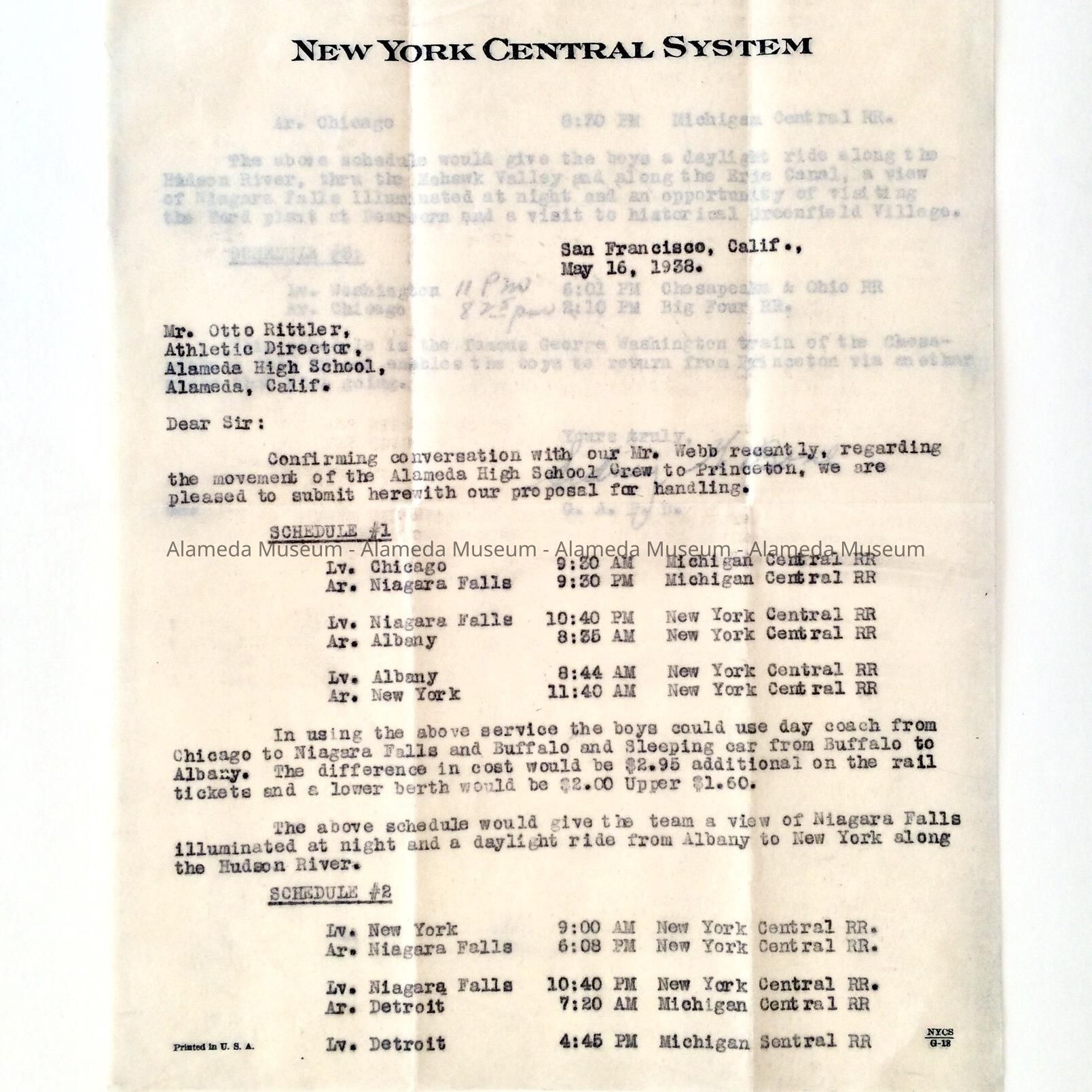 A TRAVEL SCHEDULE, DATED 1938, BY OTTO RITTLER, ATHLETIC DIRECTOR, ALAMEDA HIGH SCHOOL, FOR A TRIP TO THE NEW YORK AREA.