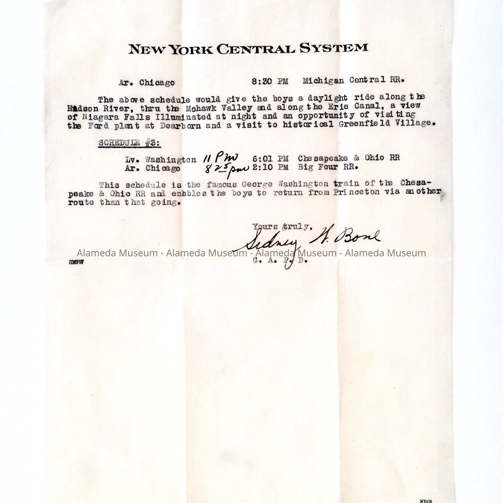 A TYPEWRITTEN ITINERARY ON TISSUE PAPER, WITH BOLD-PRINTED CAPTION, "NEW YORK CENTRAL SYSTEM."