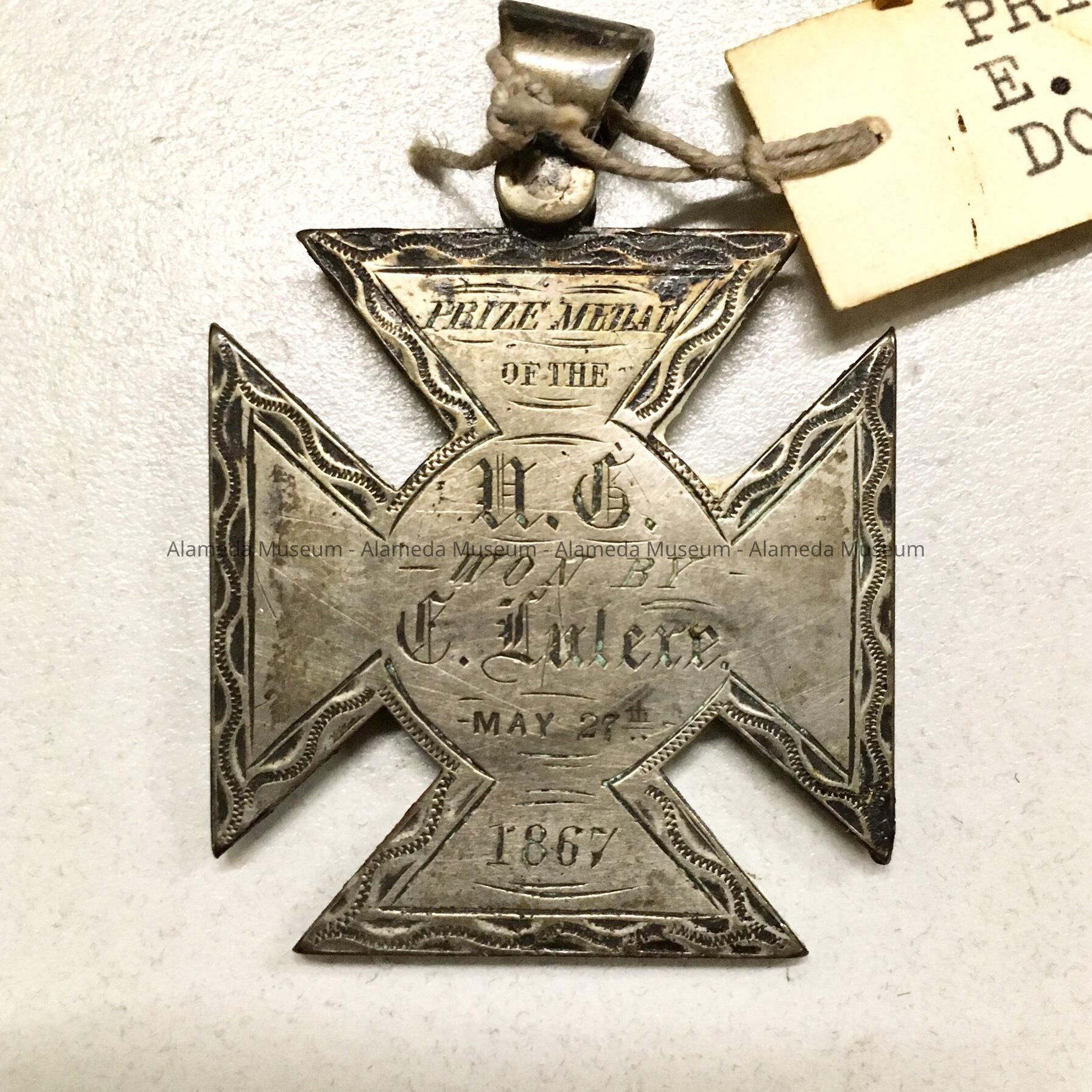 History of Object: Medal, donated on February 11 1959, and accepted by then curator Harry D. Smith of the Historical Society. The U.G. on the medal may have been from the Union Guard. E. Lulere was a misspelling for E. - Eugene Nicholas - Leclerc. The LeClere or LeClerc family came to Alameda soon after the founding; Arcene (or Arsene) Leclerc (1816-1888) was a painter, living on Pacific Ave. in 1874, and in 1875 he was joined by Eugene N (b. 1848 - d. c 1925). The family built homes on the lot stretching from Pacific Ave (2226 Pacific) to Railroad Ave (2221 / 2223 Lincoln Ave.), now the location of the Alameda Christian School. Daughter Alice was connected with the California Training Home for Girls. The donor was a granddaughter.
