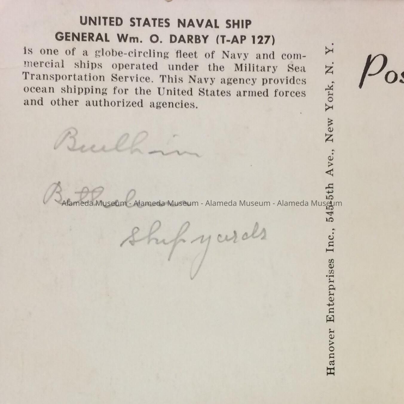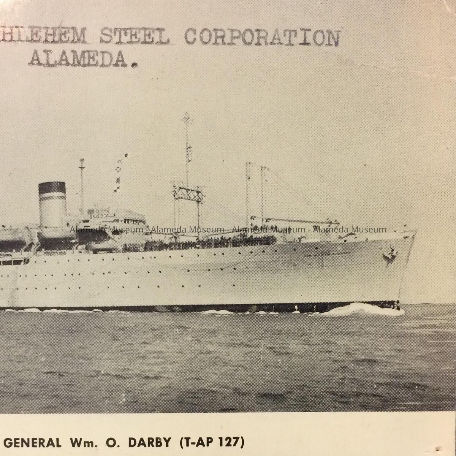 POST CARD DEPICTING THE NAVAL SHIP, "GENERAL WILLIAM O DARBY," CONSTRUCTED AT THE BETHLEHEM SHIPYARDS, ALAMEDA.