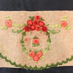 Heavy unbleached tan colored linen, envelope shaped, pocket or jacket with rose and green colored silk embroidery of flowers and leaves. Interior lined with green colored silk.