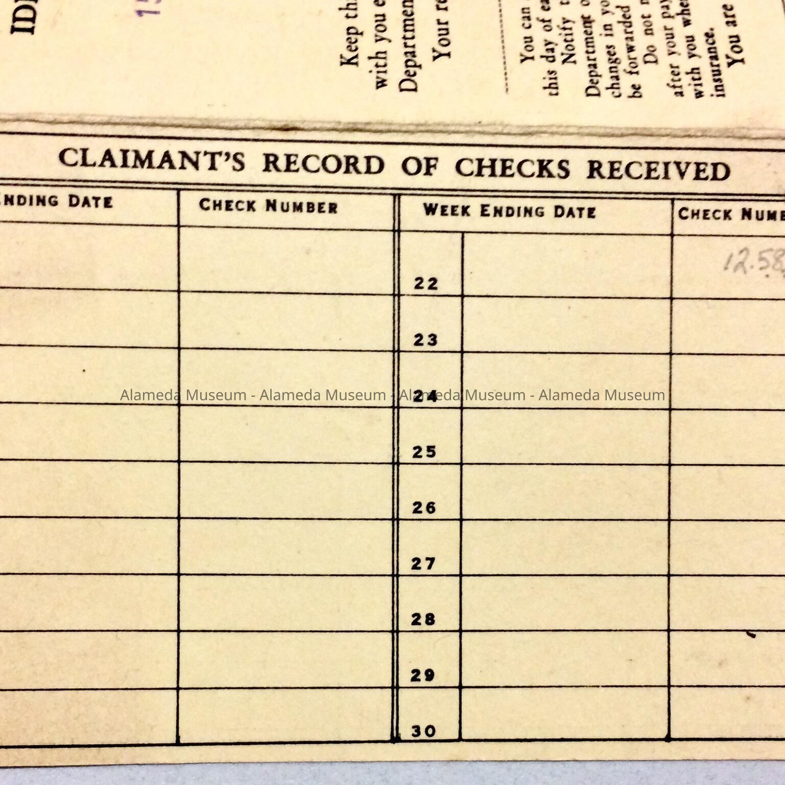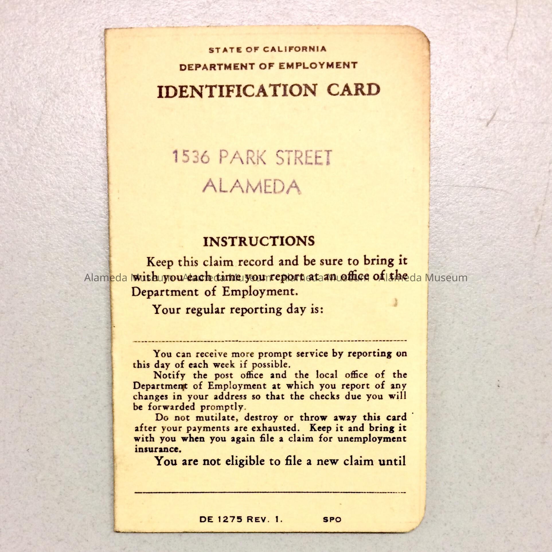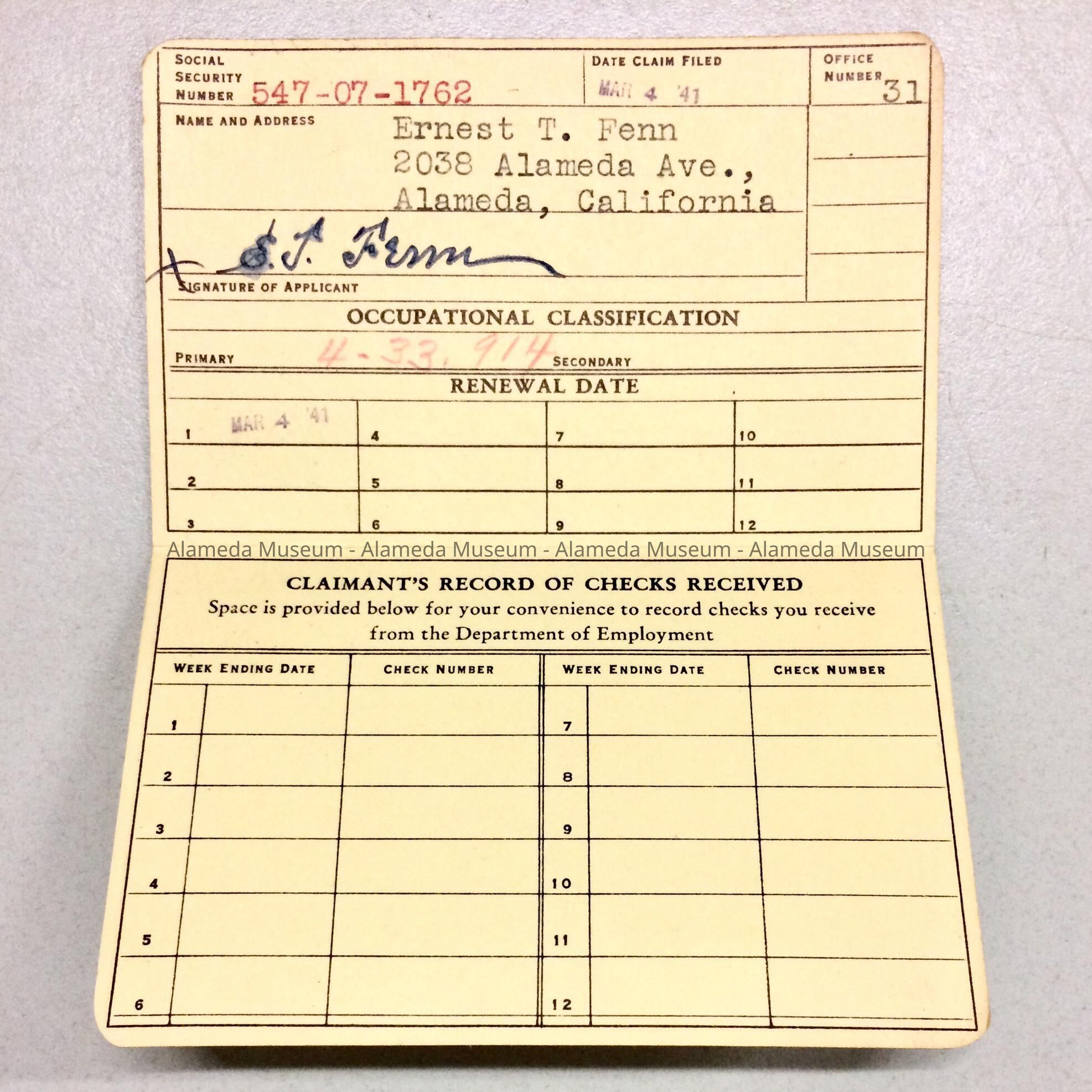 HISTORY OF OBJECT: AN ENTRY BOOKLET FOR ERNEST T. FENN FOR UNEMPLOYMENT PAYMENTS. DURING THIS TIME, THE DEPARTMENT OF EMPLOYMENT OFFICE WAS LOCATED AT 1536 PARK STREET, ALAMEDA.