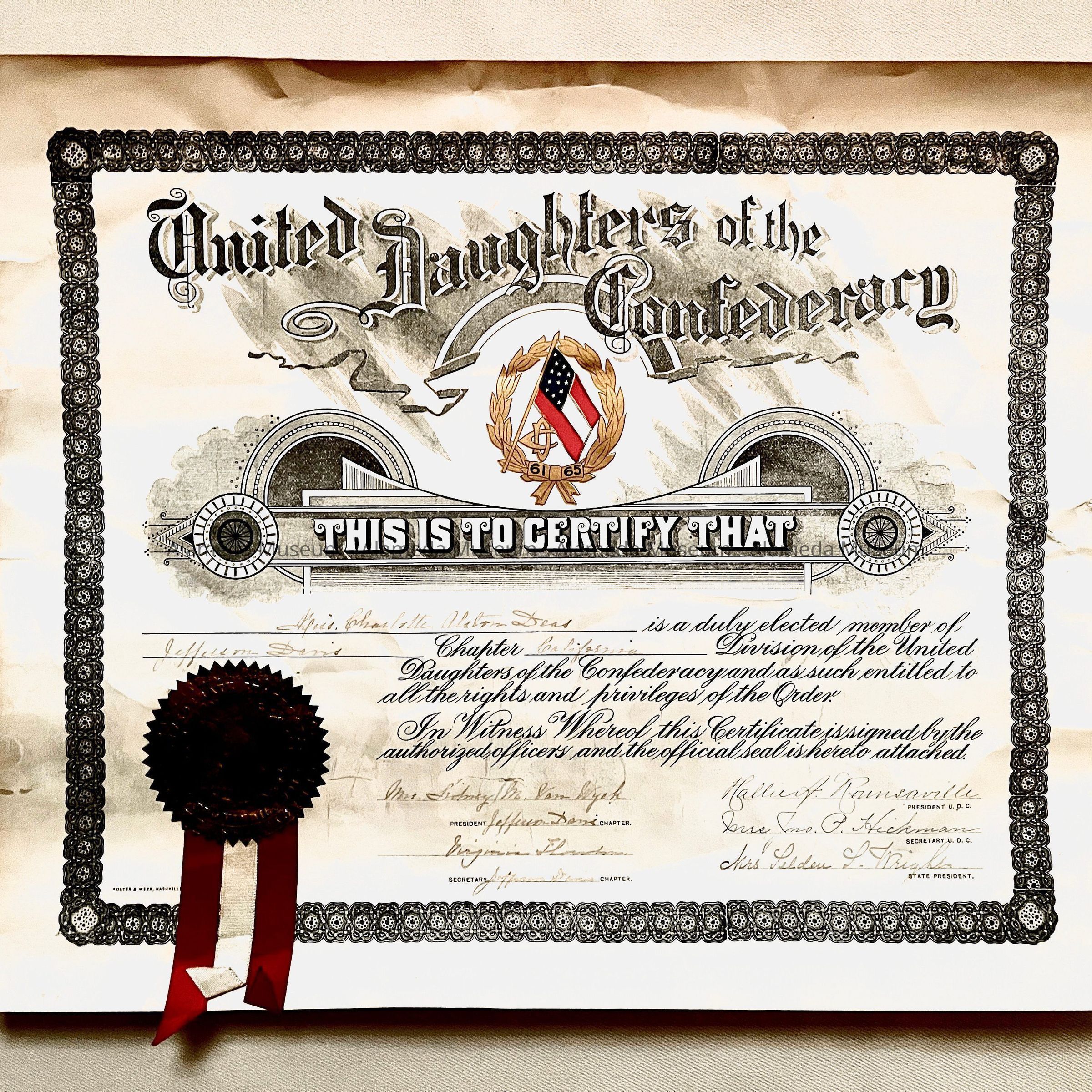 HISTORY OF OBJECT: CERTIFICATE OF MEMBERSHIP TO MISS CHARLOTTE DEAS, UNITED DAUGHTERS OF THE CONFEDERACY, CALIF CHAPTER. SIGNED BY THE OFFICERS. THE DEAS FAMILY ORIGINALLY CAME FROM SOUTH CAROLINA, WHERE THEY WERE A PIONEER FAMILY GOING BACK TO PRE-REVOLUTIONARY DAYS.
