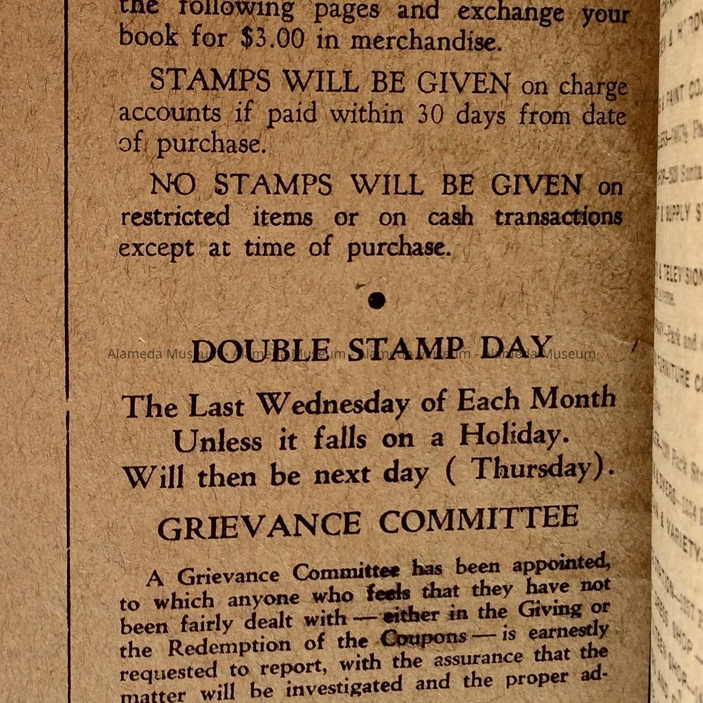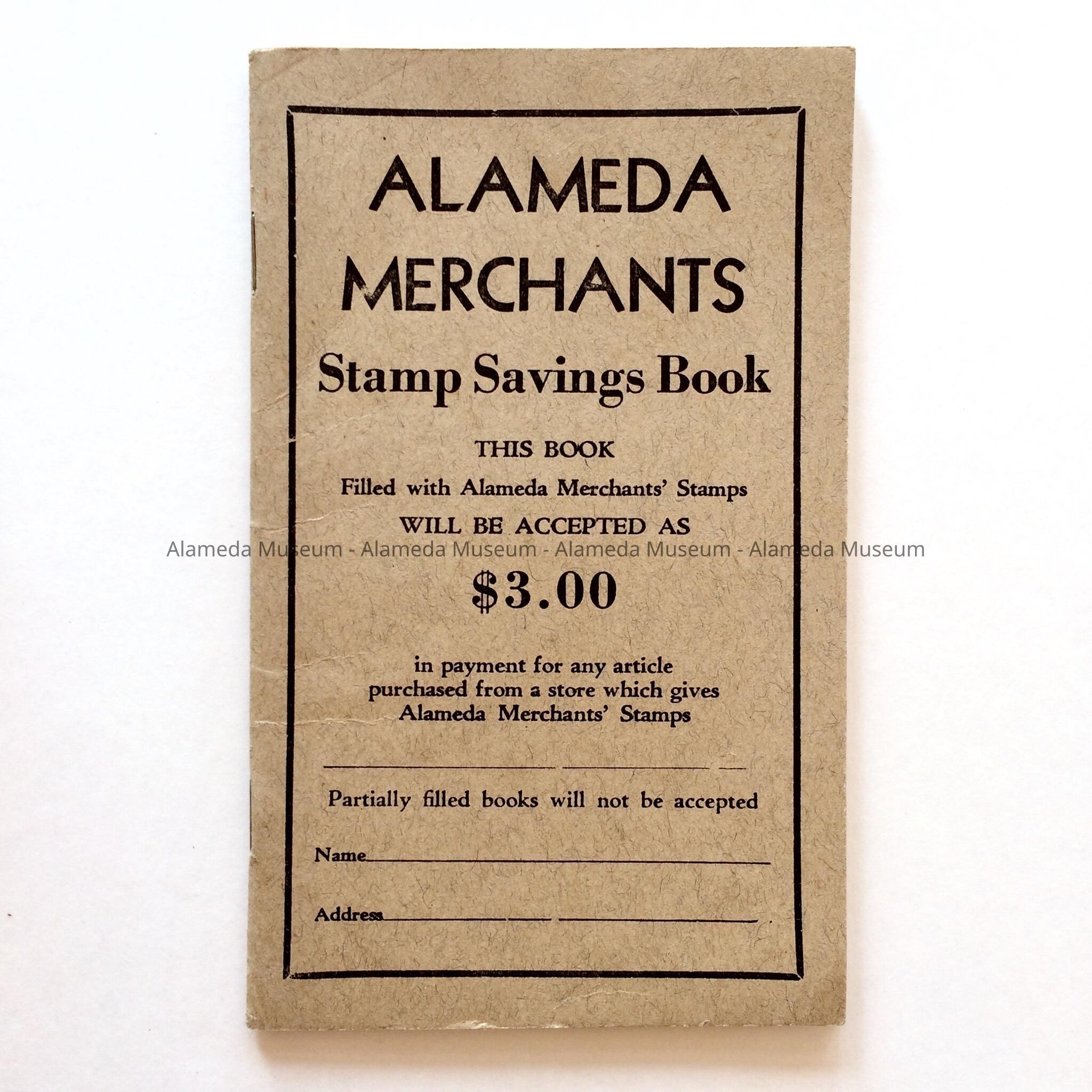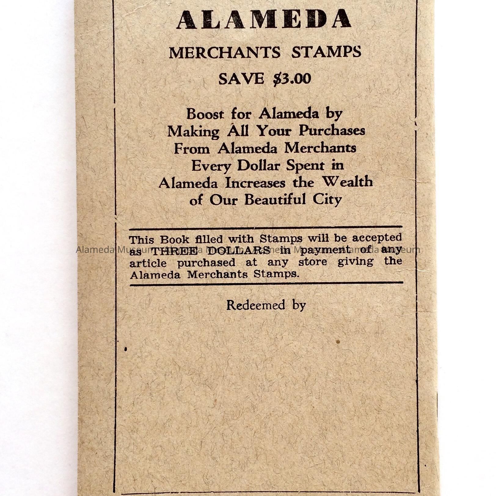 History of Object: Unused stamp savings book of Alameda merchants, includes names of participating businesses. The book is dated by the expiration period: must be redeemed before 11-1-1954.