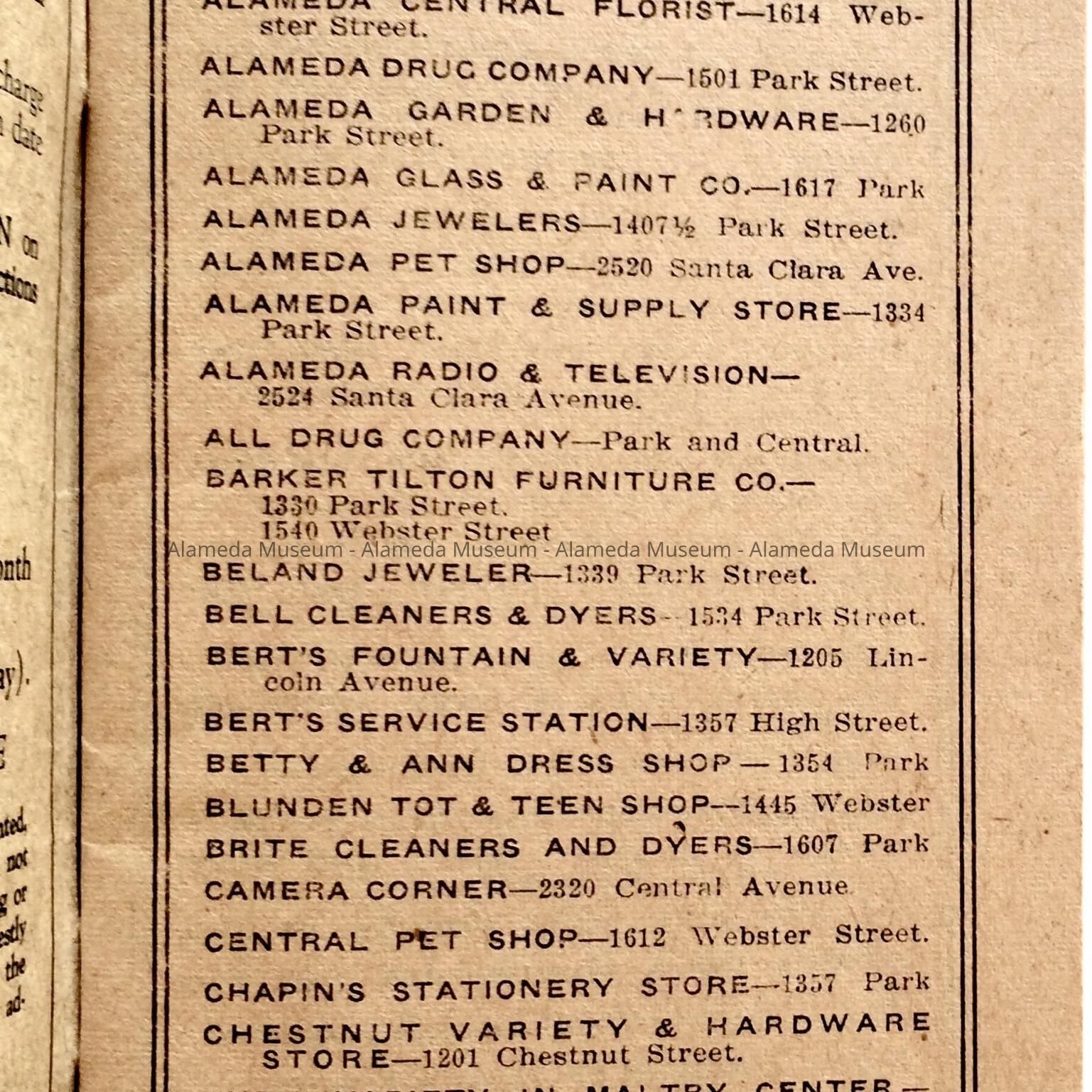 Description: Soft-bound booklet with tan cover and bold printed caption stating “Alameda Merchants” in black type.