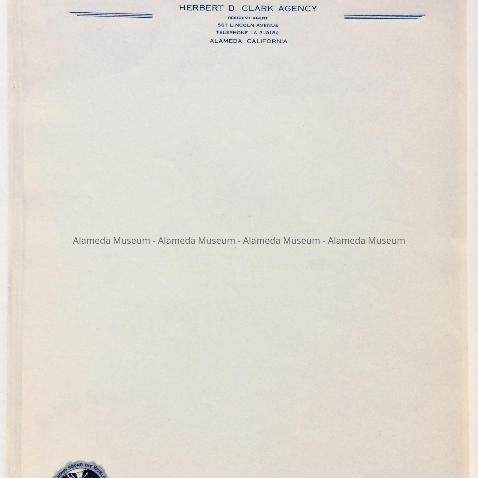 UNUSED STATIONERY OF "HERBERT D CLARK, INSURANCE, 561 LINCOLN AVE, ALAMEDA. TELEPHONE LA 3-0182." MR CLARK WAS A MEMBER OF A PIONEER ALAMEDA FAMILY. HIS LATE DAUGHTER, ELEANOR, WAS EXECUTIVE DIRECTOR, ALAMEDA BRANCH, AMERICAN RED CROSS.