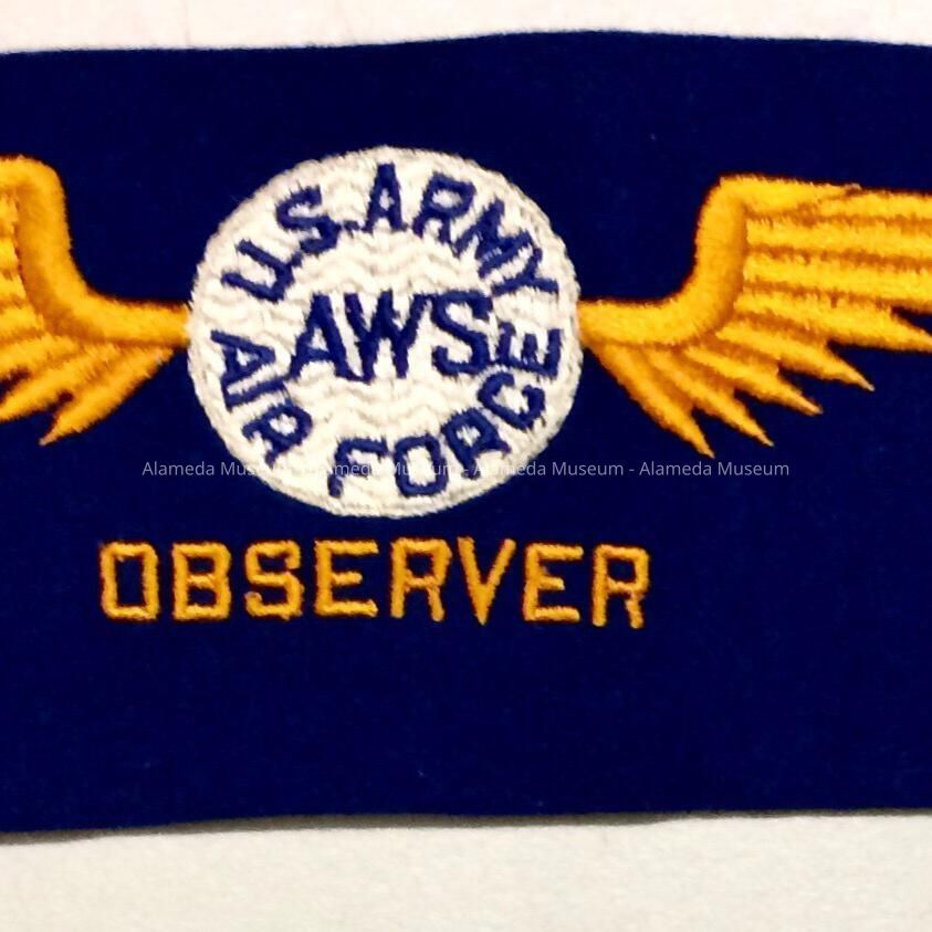 Description: Arm band of oblong-shaped dark blue-colored felt with embroidered emblem with caption, “U.S. ARMY AIR FORCE AWS” in blue-colored thread on a white-colored background. Additional caption, “OBSERVER” in gold-colored silk thread.