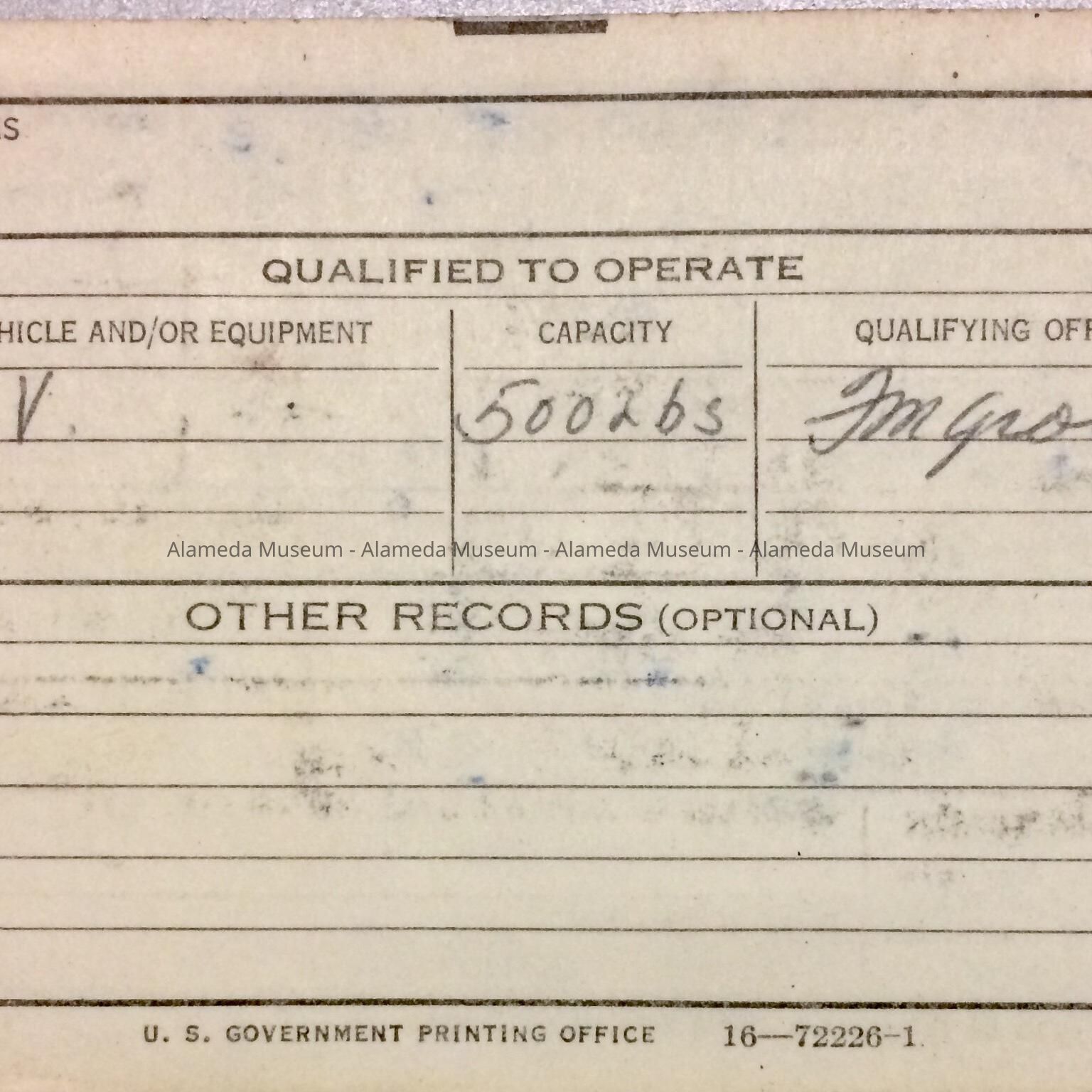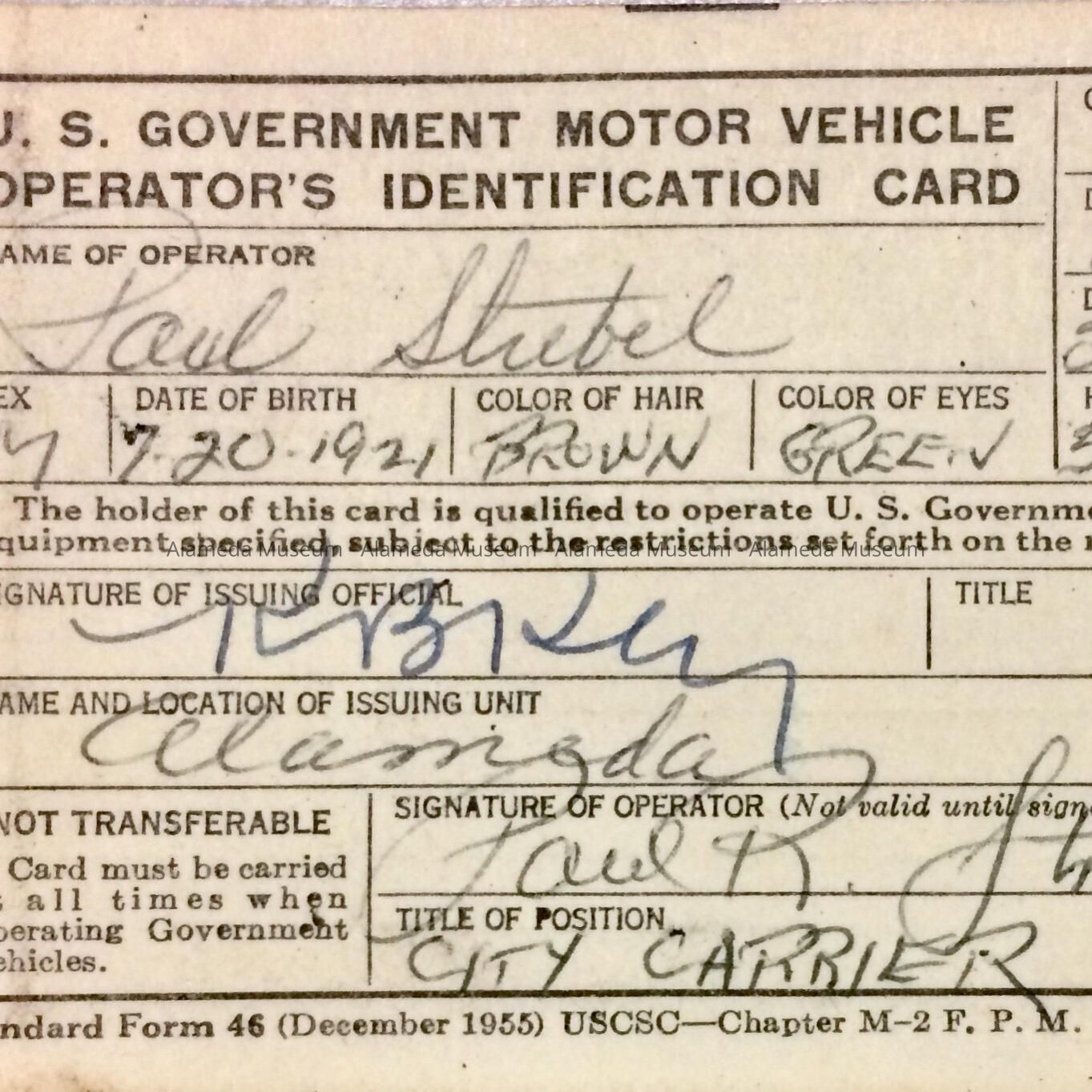 U S GOVERNMENT MOTOR VEHICLE OPERATOR'S IDENTIFICATION CARD, ISSUED TO PAUL STREBEL, WHO WAS A POSTAL CARRIER, ALAMEDA BRANCH, U S POST OFFICE.