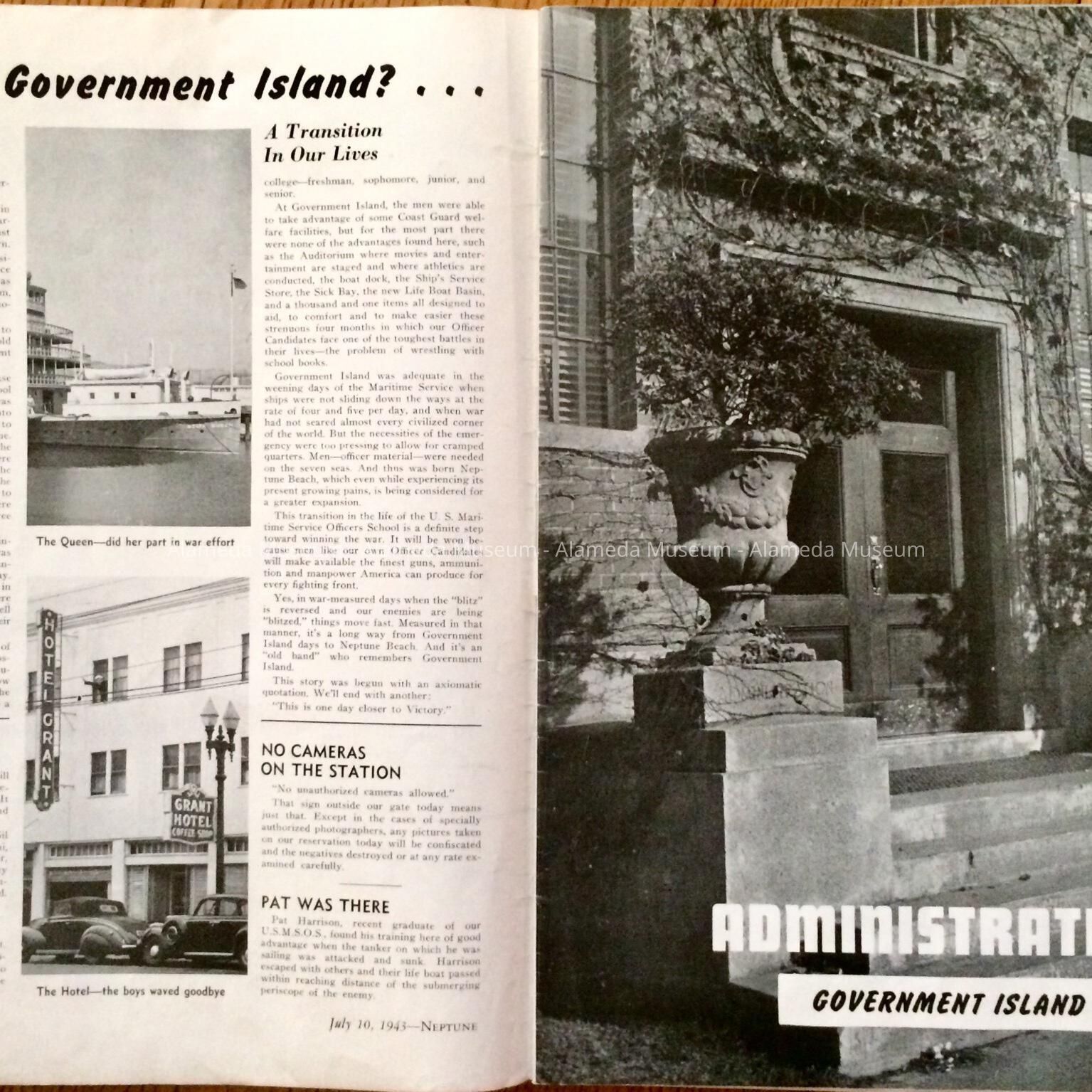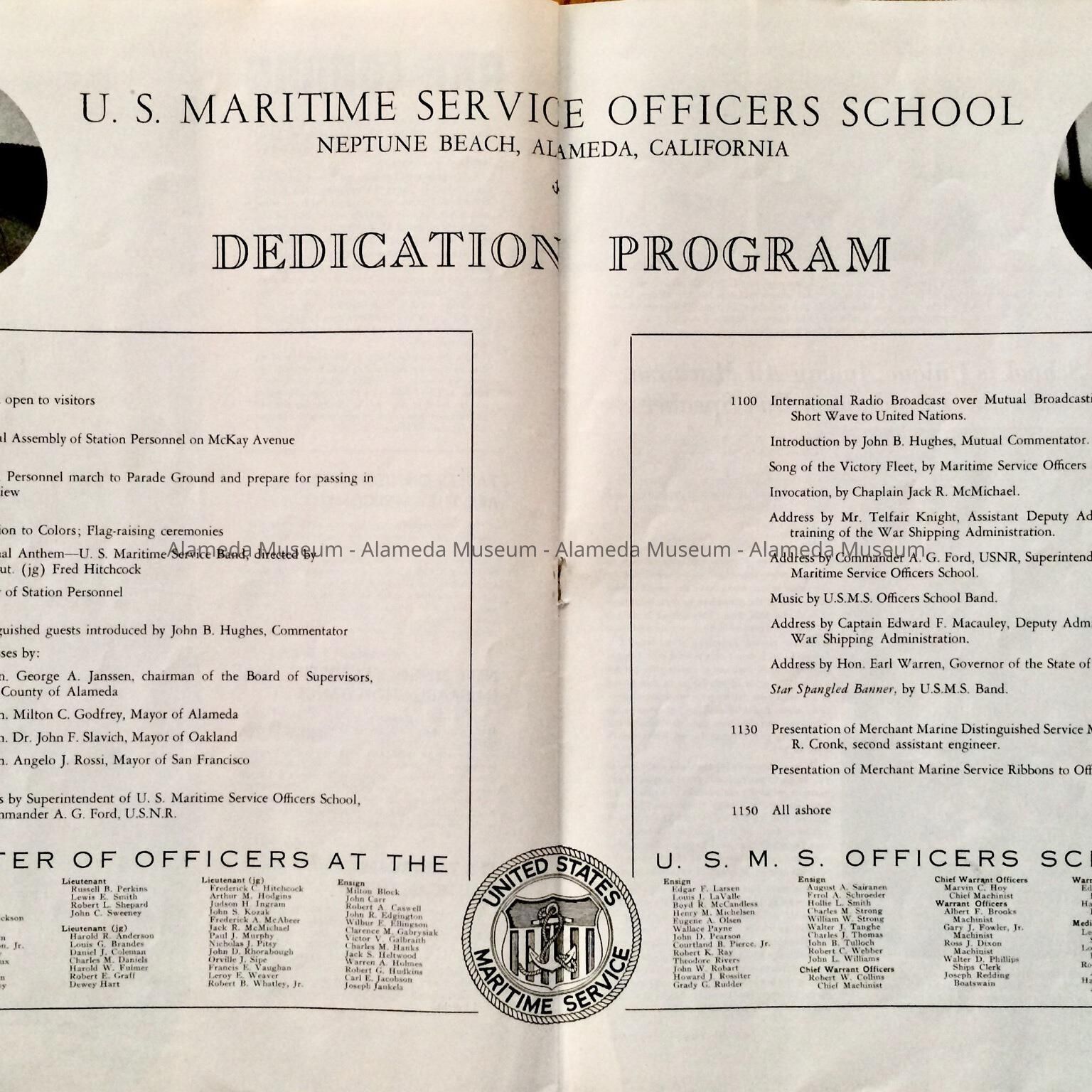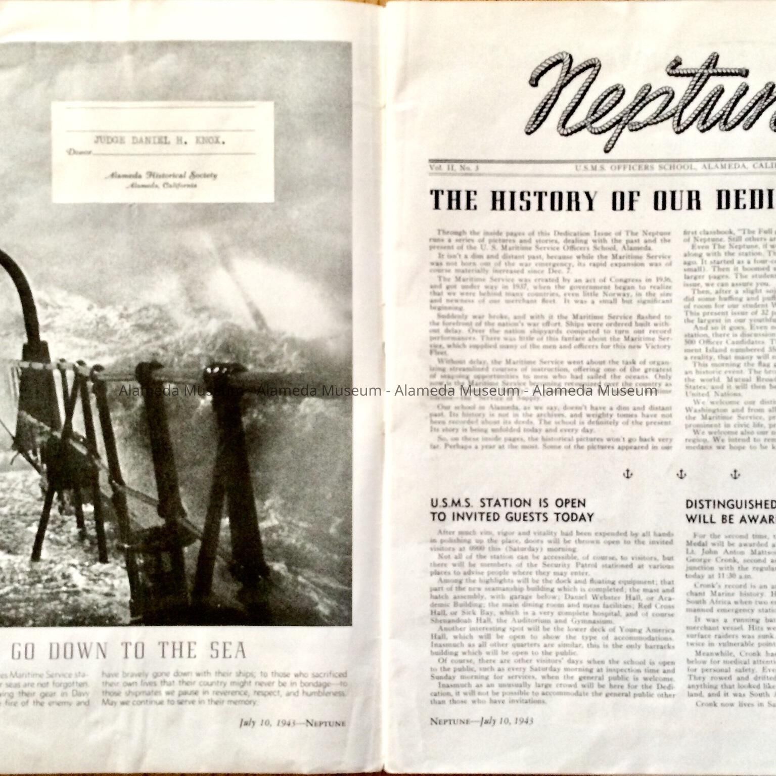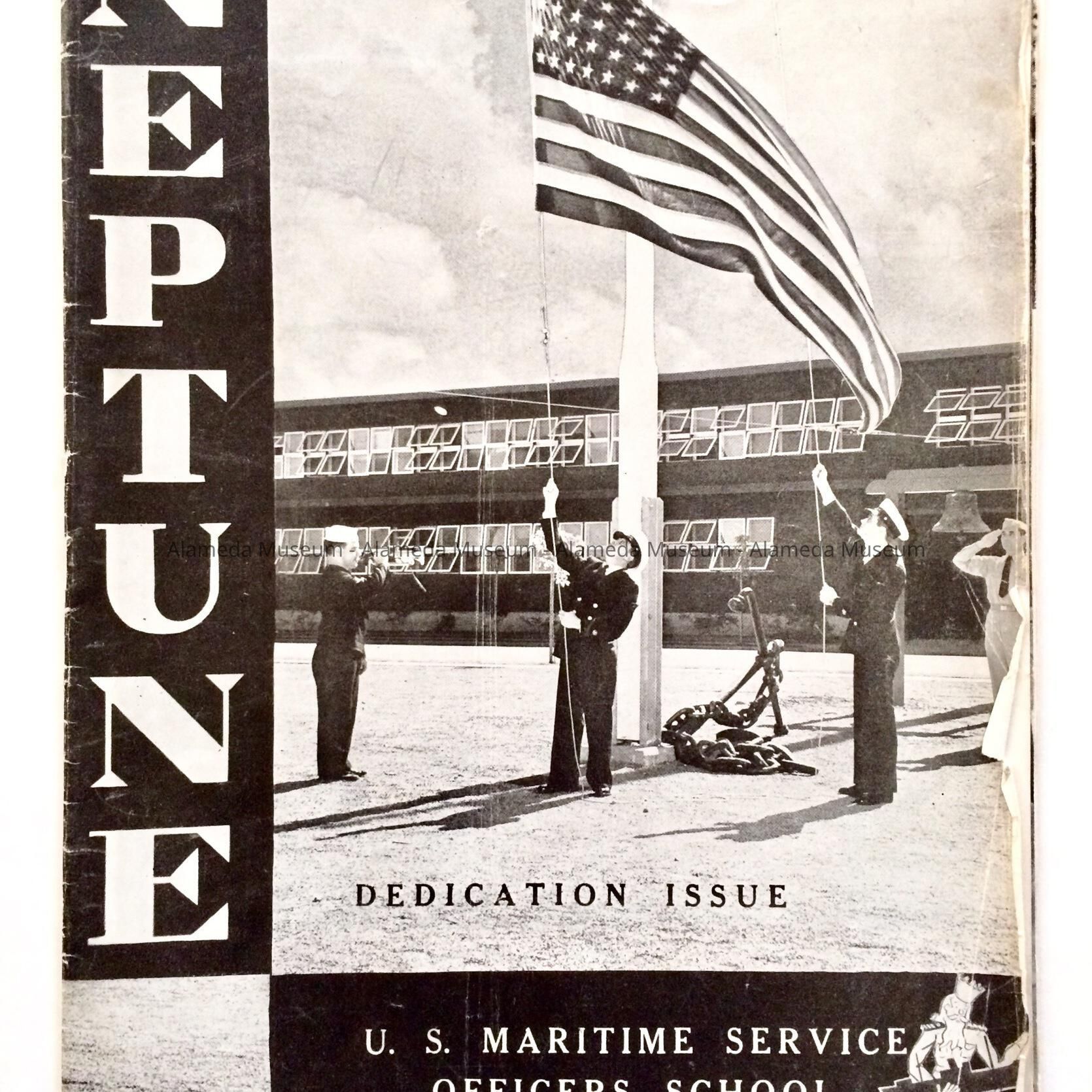 History of Object: Neptune Magazine Vol II, No.3, Dedication number, of the newsletter for the US Maritime Marine Service Officers School (or Training Center, also known as the Merchant Marines), reflecting of the dedication ceremonies of the school of July 10. 1943. Includes a history of the school, which started on Government Island, and a list of the new facilities, both on p3; photos of the premises including construction and a program of the events in the center.